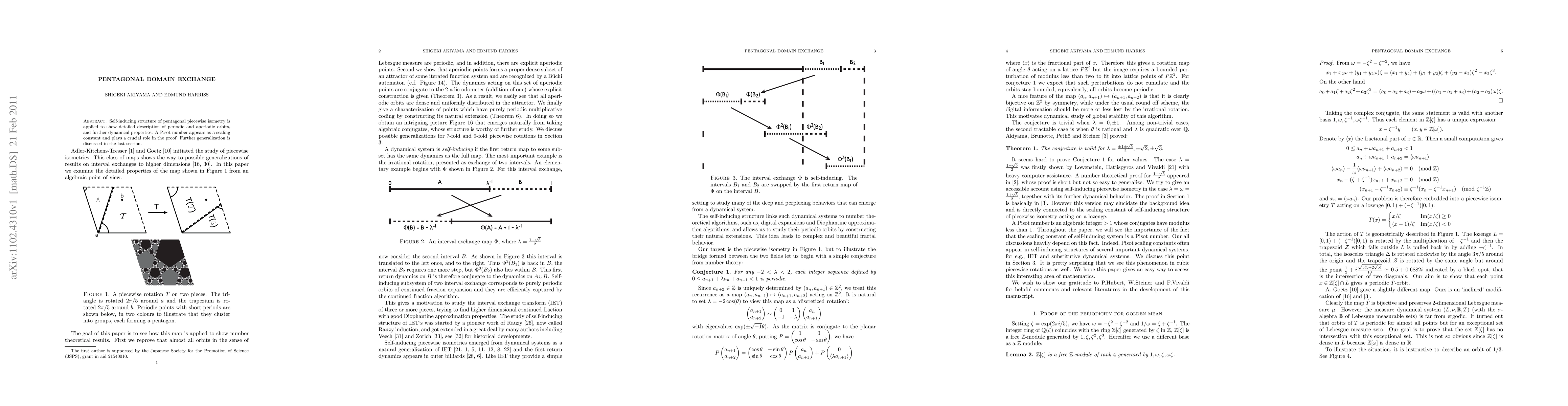 Self-inducing structure of pentagonal piecewise isometry is applied to show detailed description of periodic and aperiodic orbits, and further dynamical properties. A Pisot number appears as a scaling constant and plays a crucial role in the proof. Further generalization is discussed in the last section.