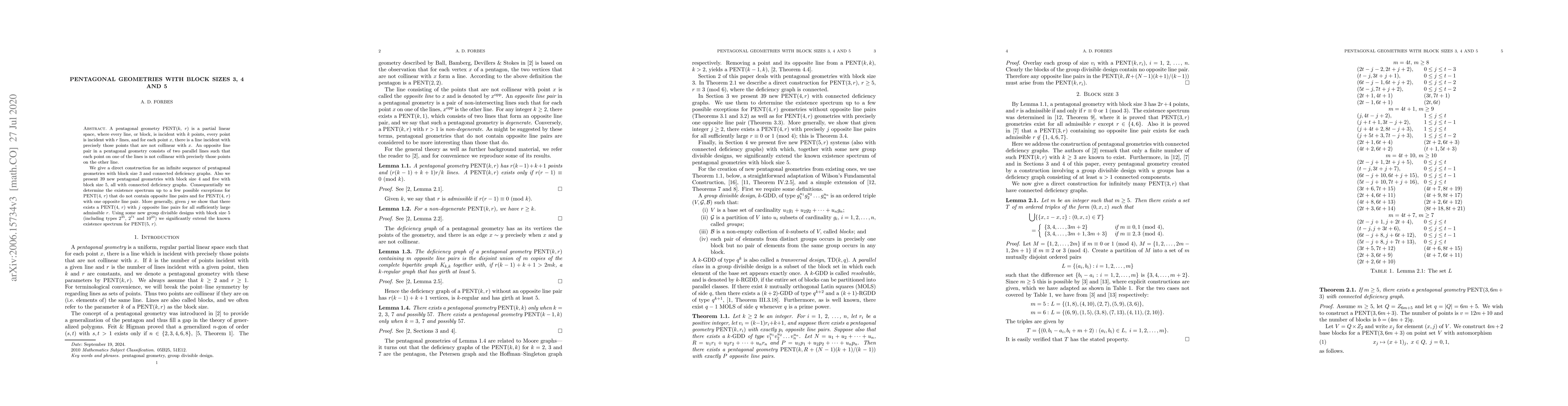 A pentagonal geometry PENT($k$, $r$) is a partial linear space, where every line, or block, is incident with $k$ points, every point is incident with $r$ lines, and for each point $x$, there is a line incident with precisely those points that are not collinear with $x$. An opposite line pair in a pentagonal geometry consists of two parallel lines such that each point on one of the lines is not collinear with precisely those points on the other line. We give a direct construction for an infinite sequence of pentagonal geometries with block size 3 and connected deficiency graphs. Also we present 39 new pentagonal geometries with block size 4 and five with block size 5, all with connected deficiency graphs. Consequentially we determine the existence spectrum up to a few possible exceptions for PENT(4, $r$) that do not contain opposite line pairs and for PENT(4, $r$) with one opposite line pair. More generally, given $j$ we show that there exists a PENT(4, $r$) with $j$ opposite line pairs for all sufficiently large admissible $r$. Using some new group divisible designs with block size 5 (including types $2^{35}$, $2^{71}$ and $10^{23}$) we significantly extend the known existence spectrum for PENT(5, $r$).