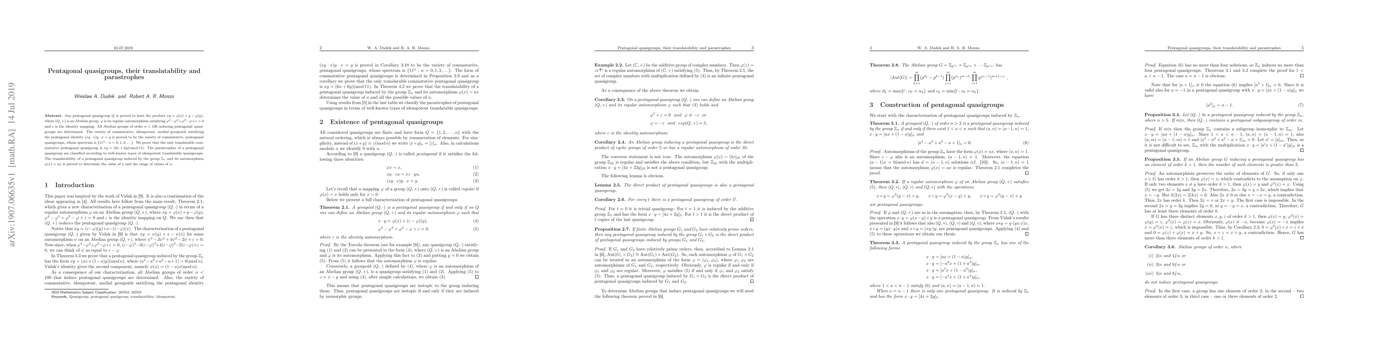 This paper explores pentagonal quasigroups and their properties, showing they follow a specific product formula. It identifies all abelian groups of order less than 100 that induce pentagonal quasigroups and classifies their parastrophes, proving the translatability conditions for commutative pentagonal quasigroups.