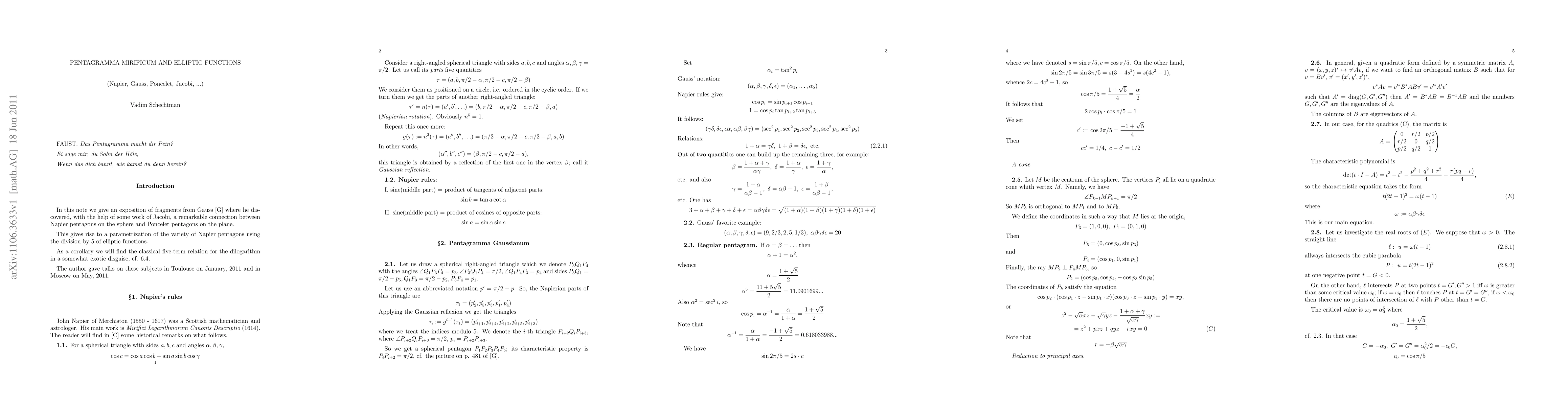 We give an exposition of fragments from Gauss [G] where he discovered, with the help of some work of Jacobi, a remarkable connection between Napier pentagons on the sphere and Poncelet pentagons on the plane. As a corollary we find a parametrization in elliptic functions of the classical dilogarithm five-term relation.