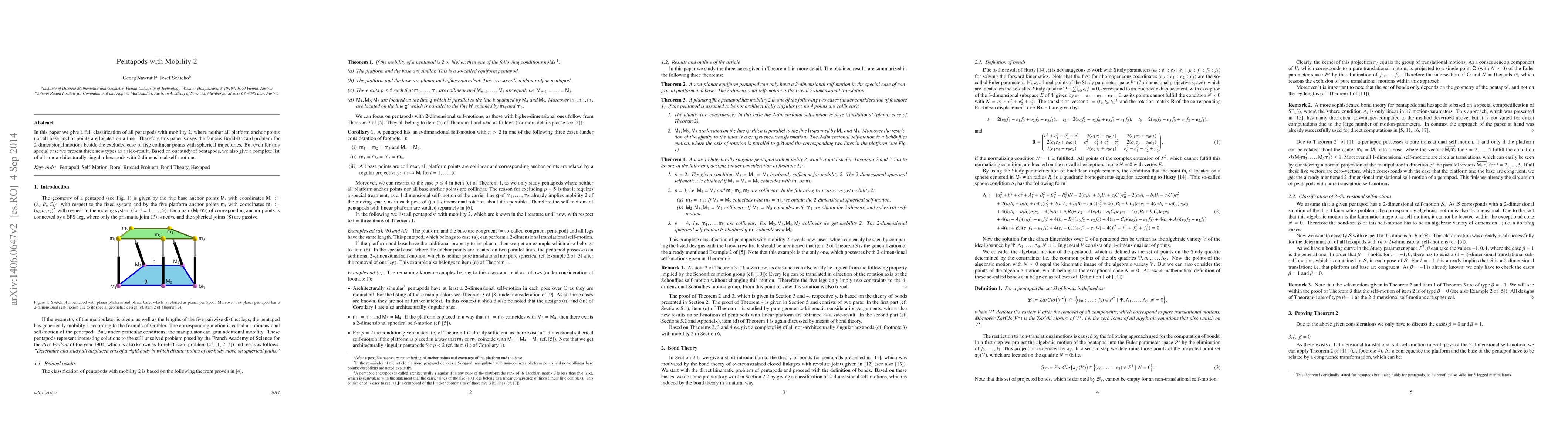 In this paper we give a full classification of all pentapods with mobility 2, where neither all platform anchor points nor all base anchor points are located on a line. Therefore this paper solves the famous Borel-Bricard problem for 2-dimensional motions beside the excluded case of five collinear points with spherical trajectories. But even for this special case we present three new types as a side-result. Based on our study of pentapods, we also give a complete list of all non-architecturally singular hexapods with 2-dimensional self-motions.