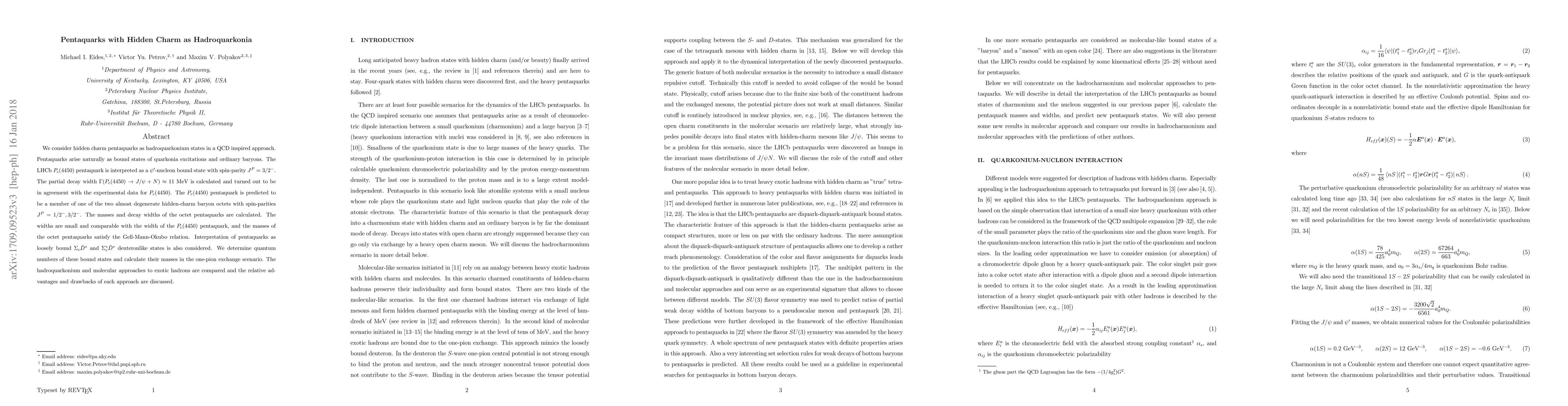 The research interprets pentaquarks as hadroquarkonia, bound states of quarkonia excitations and ordinary baryons, using a QCD-inspired approach.