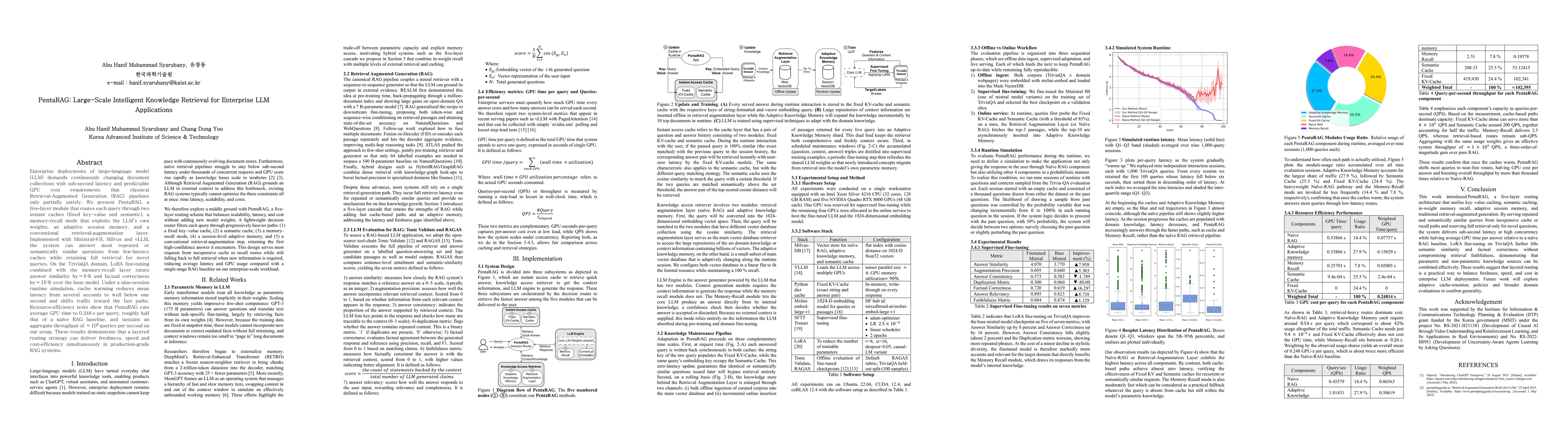Enterprise deployments of large-language model (LLM) demand continuously changing document collections with sub-second latency and predictable GPU cost requirements that classical Retrieval-Augmented Generation (RAG) pipelines only partially satisfy. We present PentaRAG, a five-layer module that routes each query through two instant caches (fixed key-value and semantic), a memory-recall mode that exploits the LLM's own weights, an adaptive session memory, and a conventional retrieval-augmentation layer. Implemented with Mistral-8B, Milvus and vLLM, the system can answer most repeated or semantically similar questions from low-latency caches while retaining full retrieval for novel queries. On the TriviaQA domain, LoRA fine-tuning combined with the memory-recall layer raises answer similarity by approximately 8% and factual correctness by approximately 16% over the base model. Under a nine-session runtime simulation, cache warming reduces mean latency from several seconds to well below one second and shifts traffic toward the fast paths. Resource-efficiency tests show that PentaRAG cuts average GPU time to 0.248 seconds per query, roughly half that of a naive RAG baseline, and sustains an aggregate throughput of approximately 100,000 queries per second on our setup. These results demonstrate that a layered routing strategy can deliver freshness, speed, and efficiency simultaneously in production-grade RAG systems.