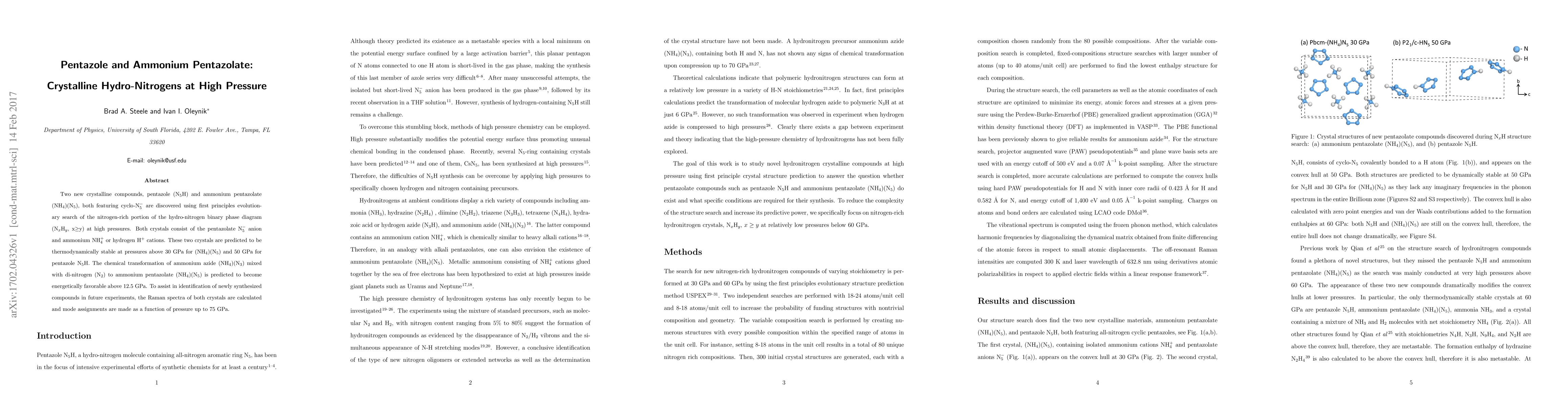 Two new crystalline compounds, pentazole (N_{5}H) and ammonium pentazolate (NH_{4})(N_{5}), both featuring cyclo-{\rm N_{5}^{-}} are discovered using first principles evolutionary search of the nitrogen-rich portion of the hydro-nitrogen binary phase diagram (N_{x}H_{y}, x\geqy) at high pressures. Both crystals consist of the pentazolate N_{5}^{-} anion and ammonium NH_{4}^{+} or hydrogen H^{+} cations. These two crystals are predicted to be thermodynamically stable at pressures above 30 GPa for (NH_{4})(N_{5}) and 50 GPa for pentazole N_{5}H. The chemical transformation of ammonium azide (NH_{4})(N_{3}) mixed with di-nitrogen (N_{2}) to ammonium pentazolate (NH_{4})(N_{5}) is predicted to become energetically favorable above 12.5 GPa. To assist in identification of newly synthesized compounds in future experiments, the Raman spectra of both crystals are calculated and mode assignments are made as a function of pressure up to 75 GPa.