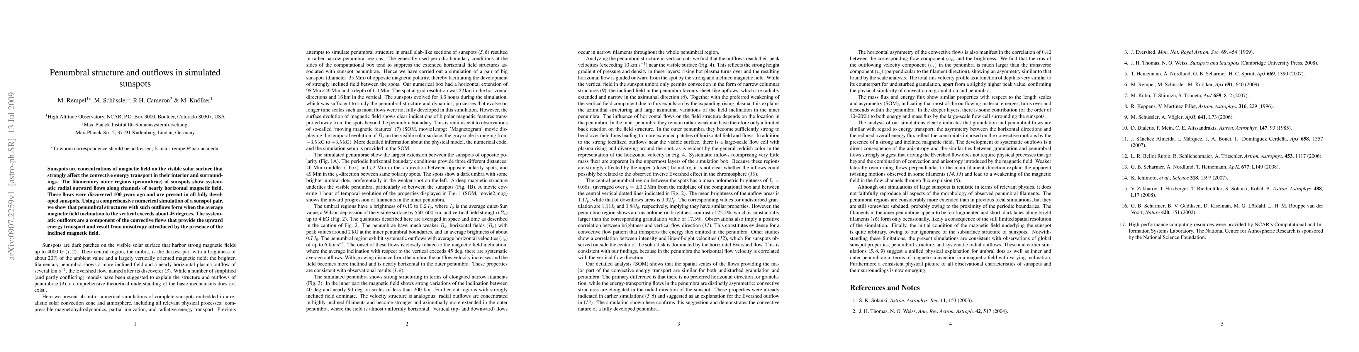 Sunspots are concentrations of magnetic field on the visible solar surface that strongly affect the convective energy transport in their interior and surroundings. The filamentary outer regions (penumbrae) of sunspots show systematic radial outward flows along channels of nearly horizontal magnetic field. These flows were discovered 100 years ago and are present in all fully developed sunspots. Using a comprehensive numerical simulation of a sunspot pair, we show that penumbral structures with such outflows form when the average magnetic field inclination to the vertical exceeds about 45 degrees. The systematic outflows are a component of the convective flows that provide the upward energy transport and result from anisotropy introduced by the presence of the inclined magnetic field.