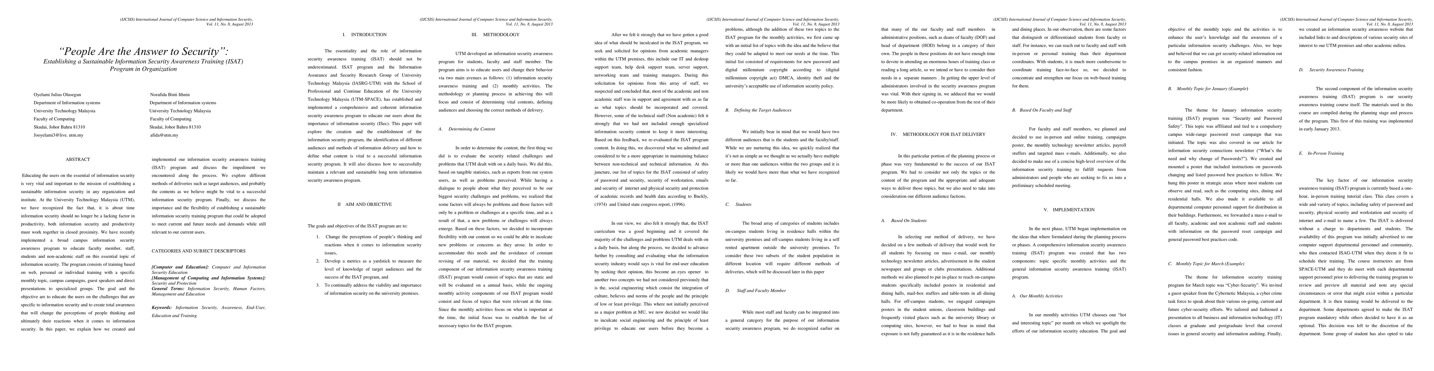 This paper details the implementation of a comprehensive information security awareness training (ISAT) program at University Technology Malaysia, emphasizing the importance of user education to enhance security and productivity. The program includes various training methods and addresses challenges encountered, highlighting the need for a flexible, sustainable approach to meet current and future security demands.