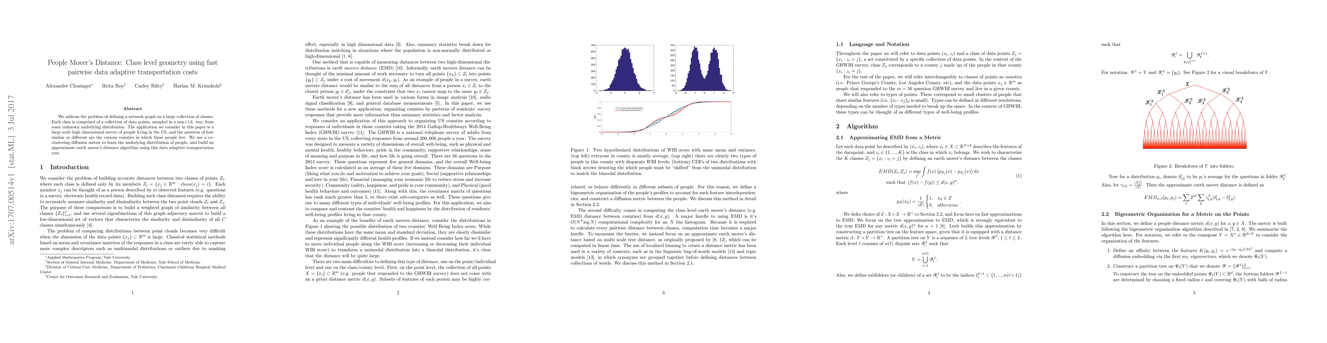 We address the problem of defining a network graph on a large collection of classes. Each class is comprised of a collection of data points, sampled in a non i.i.d. way, from some unknown underlying distribution. The application we consider in this paper is a large scale high dimensional survey of people living in the US, and the question of how similar or different are the various counties in which these people live. We use a co-clustering diffusion metric to learn the underlying distribution of people, and build an approximate earth mover's distance algorithm using this data adaptive transportation cost.