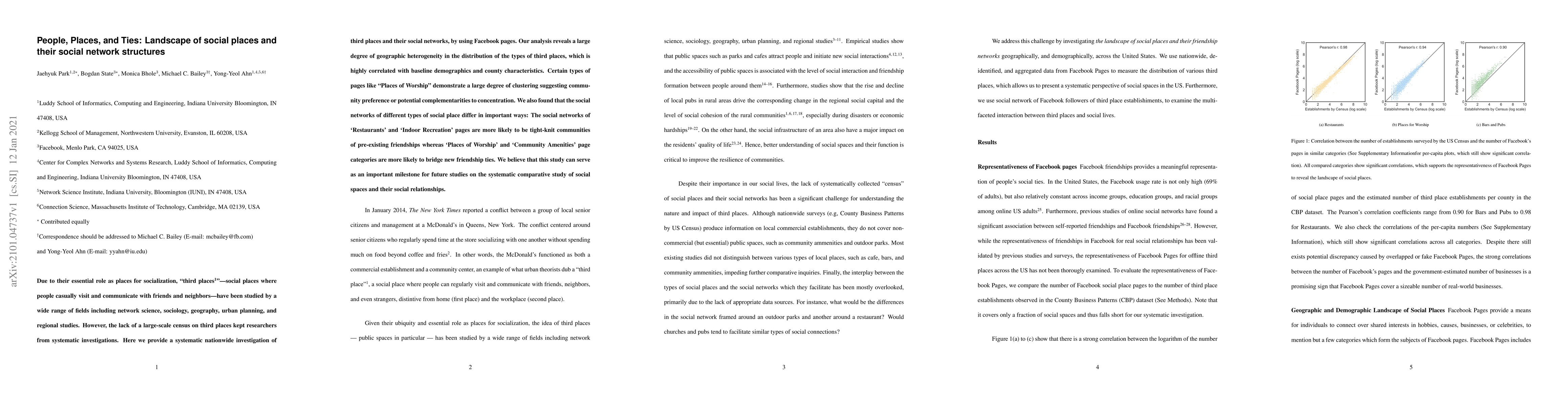 Due to their essential role as places for socialization, "third places" - social places where people casually visit and communicate with friends and neighbors - have been studied by a wide range of fields including network science, sociology, geography, urban planning, and regional studies. However, the lack of a large-scale census on third places kept researchers from systematic investigations. Here we provide a systematic nationwide investigation of third places and their social networks, by using Facebook pages. Our analysis reveals a large degree of geographic heterogeneity in the distribution of the types of third places, which is highly correlated with baseline demographics and county characteristics. Certain types of pages like "Places of Worship" demonstrate a large degree of clustering suggesting community preference or potential complementarities to concentration. We also found that the social networks of different types of social place differ in important ways: The social networks of 'Restaurants' and 'Indoor Recreation' pages are more likely to be tight-knit communities of pre-existing friendships whereas 'Places of Worship' and 'Community Amenities' page categories are more likely to bridge new friendship ties. We believe that this study can serve as an important milestone for future studies on the systematic comparative study of social spaces and their social relationships.