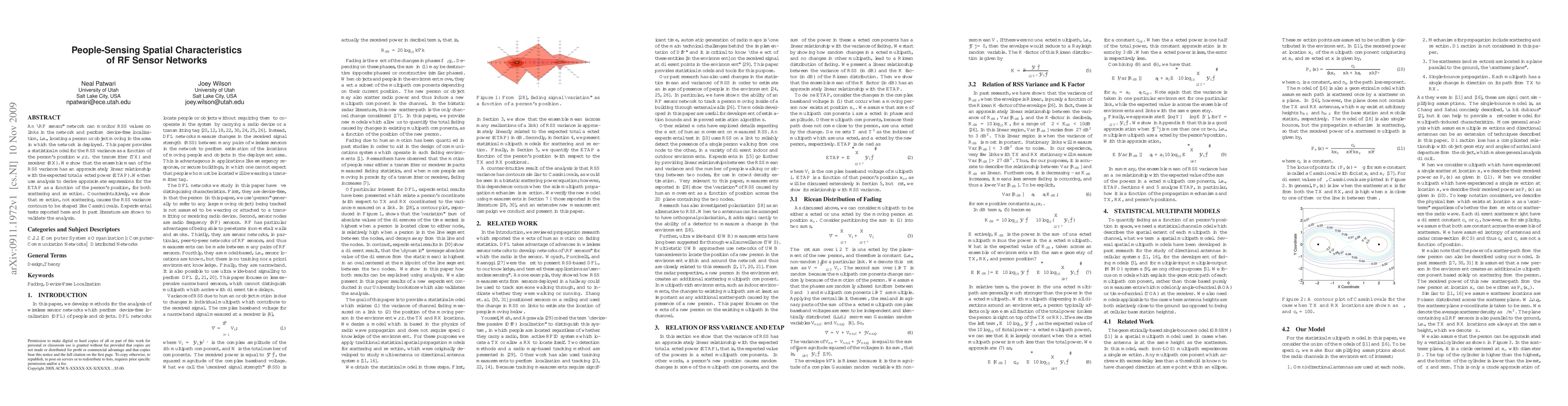 A study provides a statistical model for RF sensor network RSS variance to track person movement, finding an approximately linear relationship between RSS variance and affected power, with reflection causing Cassini oval-shaped contours.
