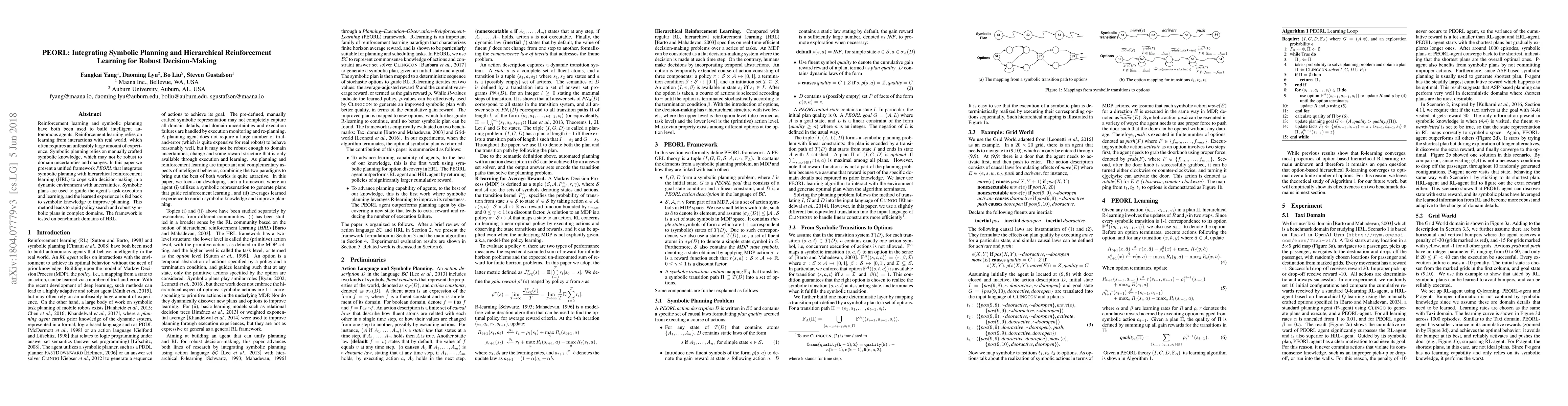The paper presents PEORL, a framework that integrates symbolic planning with hierarchical reinforcement learning (HRL) for robust decision-making in dynamic environments with uncertainties. Symbolic plans guide task execution and learning, with learned experiences feeding back to improve symbolic knowledge.