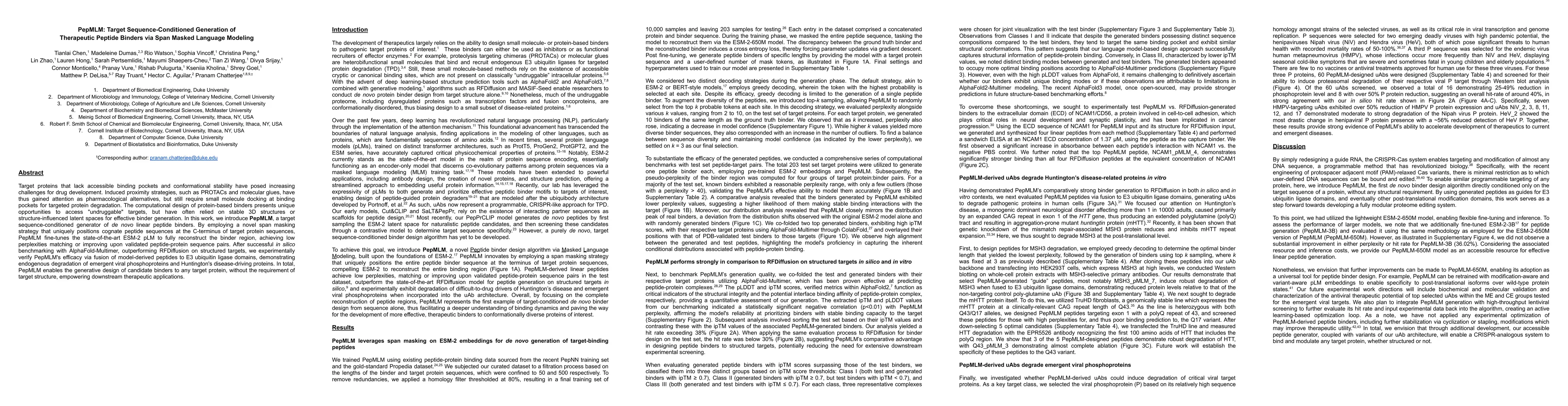 PepMLM introduces a novel masked language model for generating peptide binders directly from target protein sequences, bypassing the need for structural information. This method successfully reconstructs binder regions and demonstrates effective protein degradation in cellular models, offering a new approach for drug development targeting undruggable proteins.