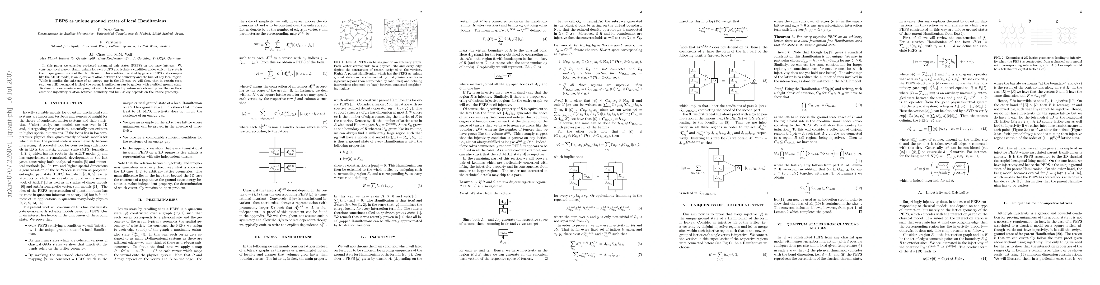This paper constructs local Hamiltonians for projected entangled pair states (PEPS) and identifies conditions under which PEPS are unique ground states. It demonstrates that an injective boundary-bulk relation ensures uniqueness, with examples like the AKLT model, and shows that gapless critical ground states can occur in certain 2D lattices due to lattice geometry.