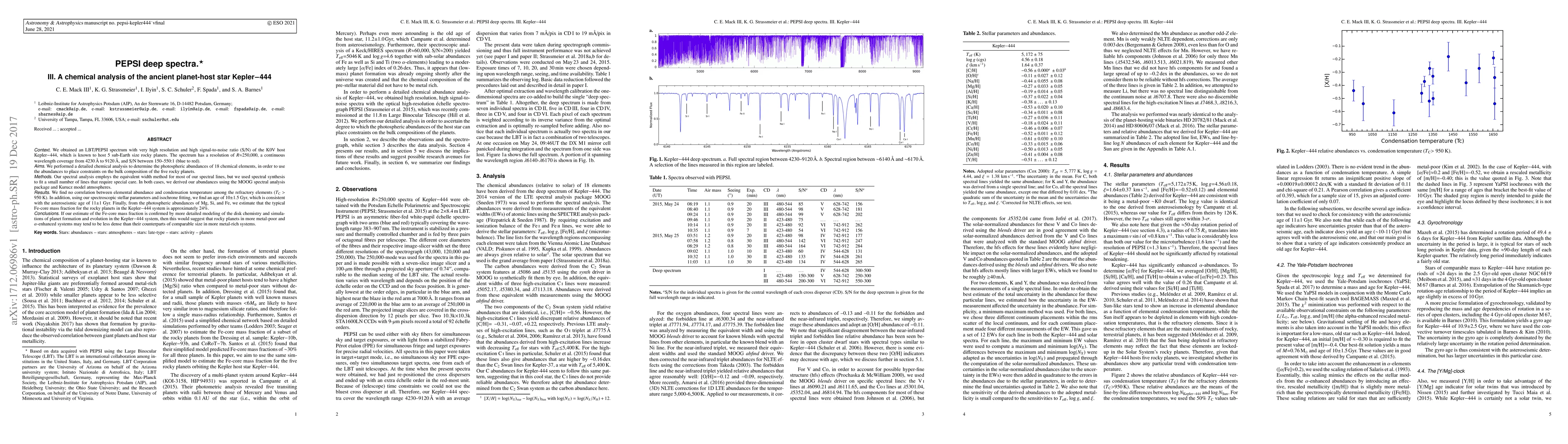 We obtained an LBT/PEPSI spectrum with very high resolution and high signal-to-noise ratio (S/N) of the K0V host Kepler-444, which is known to host 5 sub-Earth size rocky planets. The spectrum has a resolution of R=250,000, a continuous wavelength coverage from 4230 to 9120A, and S/N between 150 and 550:1 (blue to red). We performed a detailed chemical analysis to determine the photospheric abundances of 18 chemical elements, in order to use the abundances to place constraints on the bulk composition of the five rocky planets. Our spectral analysis employs the equivalent width method for most of our spectral lines, but we used spectral synthesis to fit a small number of lines that require special care. In both cases, we derived our abundances using the MOOG spectral analysis package and Kurucz model atmospheres. We find no correlation between elemental abundance and condensation temperature among the refractory elements. In addition, using our spectroscopic stellar parameters and isochrone fitting, we find an age of 10+/-1.5 Gyr, which is consistent with the asteroseismic age of 11+/-1 Gyr. Finally, from the photospheric abundances of Mg, Si, and Fe, we estimate that the typical Fe-core mass fraction for the rocky planets in the Kepler-444 system is approximately 24 per cent. If our estimate of the Fe-core mass fraction is confirmed by more detailed modeling of the disk chemistry and simulations of planet formation and evolution in the Kepler-444 system, then this would suggest that rocky planets in more metal-poor and alpha-enhanced systems may tend to be less dense than their counterparts of comparable size in more metal-rich systems.