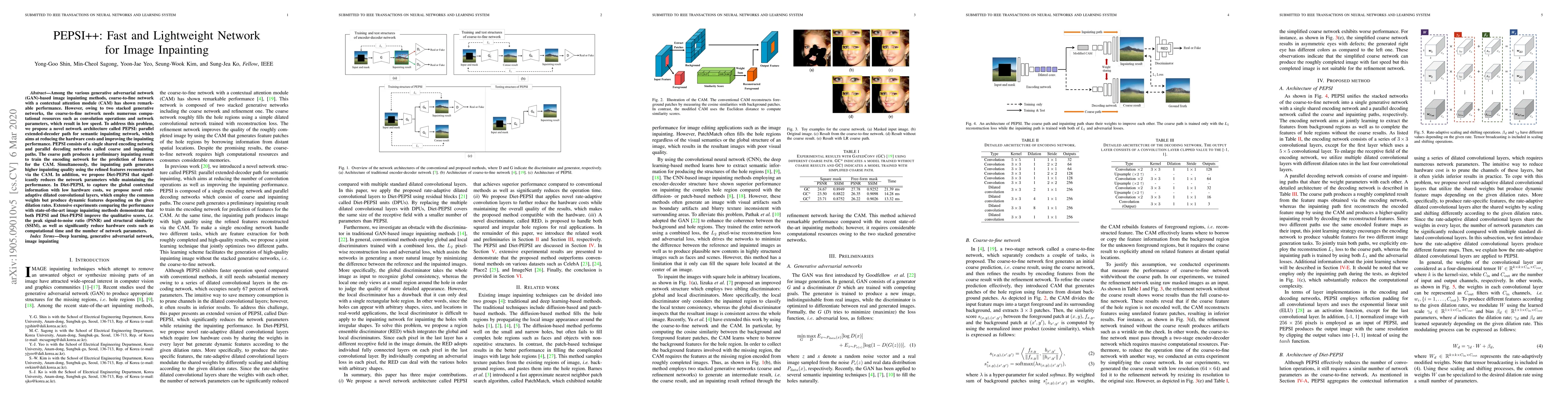 PEPSI introduces a lightweight network architecture for fast image inpainting by using parallel decoding paths and a shared encoding network, while Diet-PEPSI further reduces parameters with rate-adaptive dilated convolutions, achieving better performance and lower computational costs compared to state-of-the-art methods.