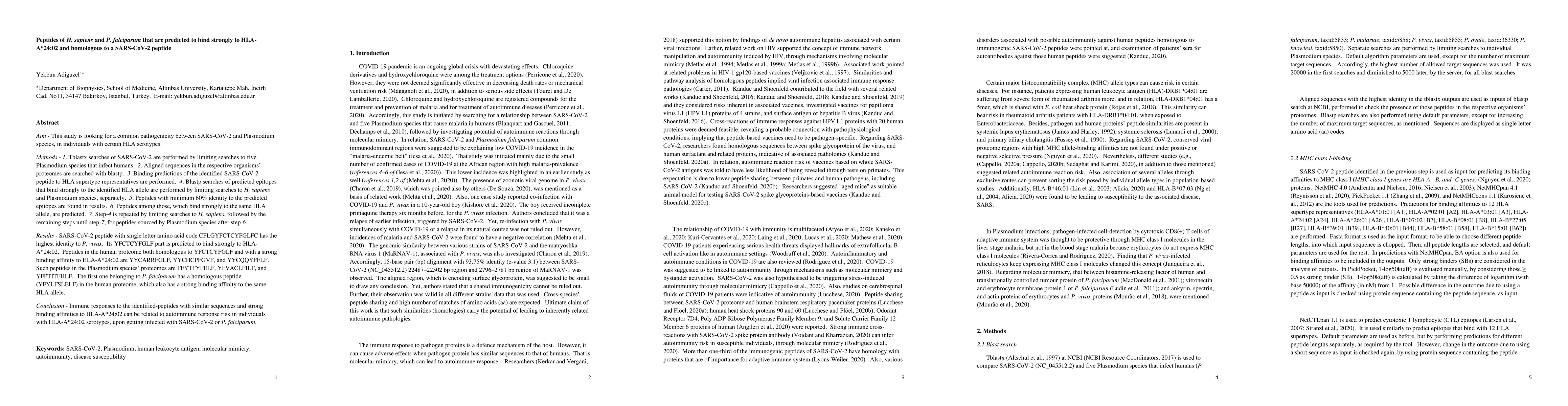 Aim: This study is looking for a common pathogenicity between SARS-CoV-2 and plasmodium species, in individuals with certain HLA serotypes. Methods: 1-) Tblastx searches of SARS-CoV-2 are performed by limiting searches to plasmodium species that infect human. 2-) Aligned sequences in the respective organisms' proteomes are searched with blastp. 3-) Binding predictions of the identified SARS-CoV-2 peptide to MHC class I supertype representatives are performed. 4-) Blastp searches of predicted-epitopes that bind strongly to the identified HLA allele are performed by limiting searches to human and to the plasmodium species. 5-) Peptides with minimum 60 % identity to the predicted-epitopes are found in results. 6-) Peptides among those, which bind strongly to the same HLA allele, are predicted. 7-) Step-4 is repeated by limiting searches to human, for peptides sourced by limiting searches to plasmodium species at step-4. 8-) Step-5 and 6 are performed with results of 7. Results: CFLGYFCTCYFGLFC peptide of SARS-CoV-2 has the highest identity to P. vivax. Its GYFCTCYFGLF and YFCTCYFGLF parts are predicted to bind strongly to HLA-A*24:02. Results obtained only for peptides homologous to YFCTCYFGLF, as follows: YYCARRFGLF, YYCHCPFGVF, and YYCQQYFFLF are potential HLA-A*24:02 epitopes in the human proteome. Among FFYTFYFELF, YFVACLFILF, and YFPTITFHLF peptides in the plasmodium species' proteomes with strong binding affinity to HLA-A*24:02, only FFYTFYFELF of P. falciparum is homologous to the potential HLA-A*24:02 epitope YFYLFSLELF in the human proteome. Conclusion: Immune responses to the identified-peptides with similar sequences and strong binding affinities to HLA-A*24:02 may lead to autoimmune response risk in individuals with HLA-A*24:02 serotypes, upon getting infected with SARS-CoV-2 or P. falciparum.