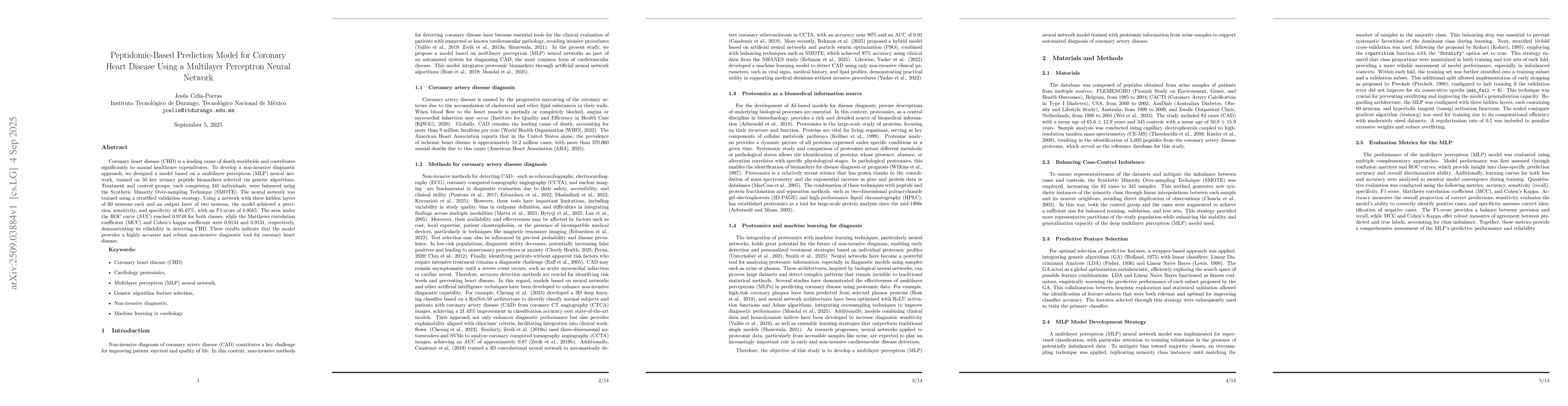 Coronary heart disease (CHD) is a leading cause of death worldwide and contributes significantly to annual healthcare expenditures. To develop a non-invasive diagnostic approach, we designed a model based on a multilayer perceptron (MLP) neural network, trained on 50 key urinary peptide biomarkers selected via genetic algorithms. Treatment and control groups, each comprising 345 individuals, were balanced using the Synthetic Minority Over-sampling Technique (SMOTE). The neural network was trained using a stratified validation strategy. Using a network with three hidden layers of 60 neurons each and an output layer of two neurons, the model achieved a precision, sensitivity, and specificity of 95.67 percent, with an F1-score of 0.9565. The area under the ROC curve (AUC) reached 0.9748 for both classes, while the Matthews correlation coefficient (MCC) and Cohen's kappa coefficient were 0.9134 and 0.9131, respectively, demonstrating its reliability in detecting CHD. These results indicate that the model provides a highly accurate and robust non-invasive diagnostic tool for coronary heart disease.