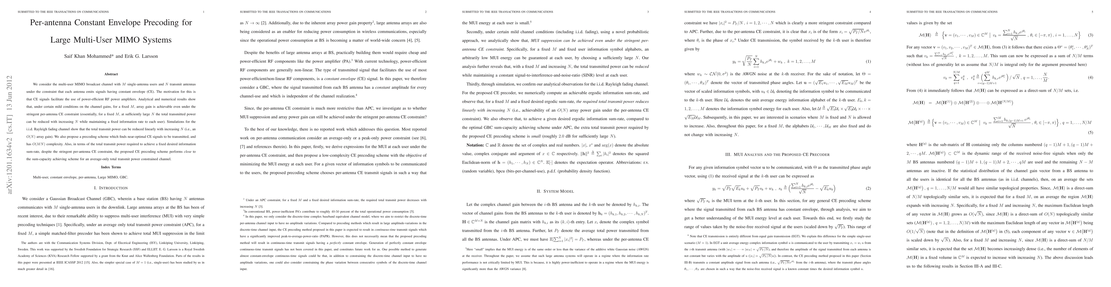 This paper proposes a per-antenna constant envelope precoding scheme for large multi-user MIMO systems, demonstrating that array gain can be achieved under the constraint of constant envelope signals, which are power-efficient. The proposed scheme achieves near-optimal performance with O(MN) complexity and shows linear reduction in total transmit power with increasing number of transmit antennas.