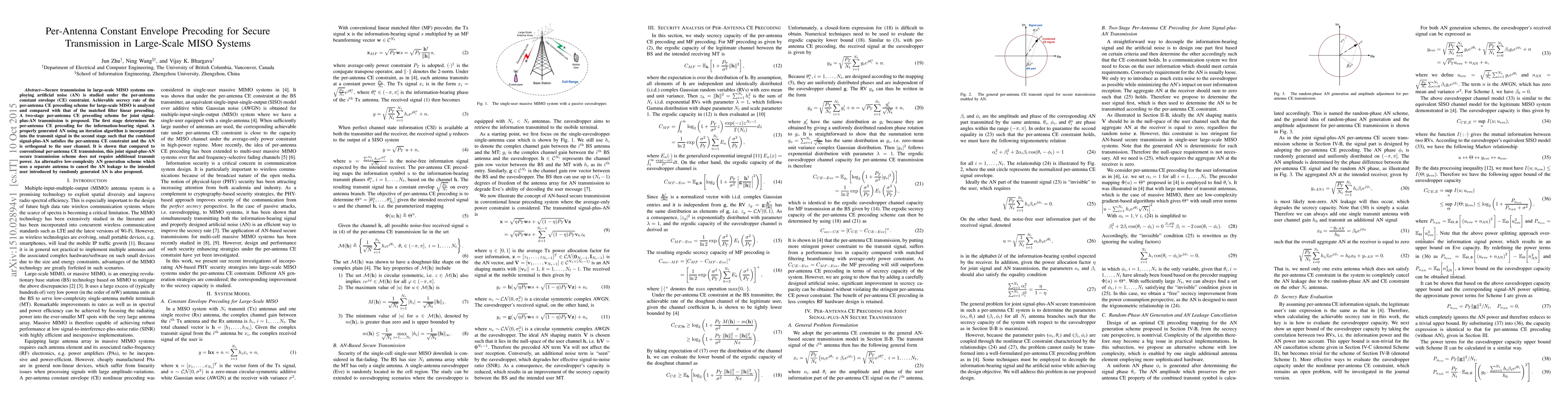 This paper proposes a per-antenna constant envelope precoding scheme for secure transmission in large-scale MISO systems using artificial noise. It introduces a two-stage method for joint signal-plus-AN transmission that maintains the constant envelope constraint without extra power, compared favorably to matched filter linear precoding.