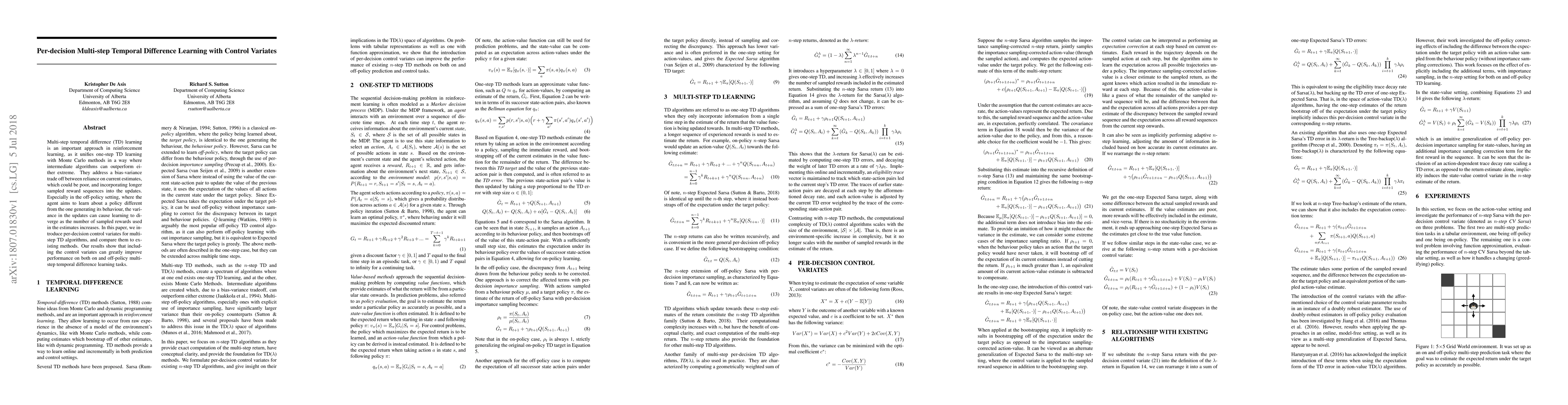 This paper introduces per-decision control variates to multi-step temporal difference learning algorithms, aiming to address the bias-variance trade-off. The results show significant performance improvements in both on-policy and off-policy learning scenarios.
