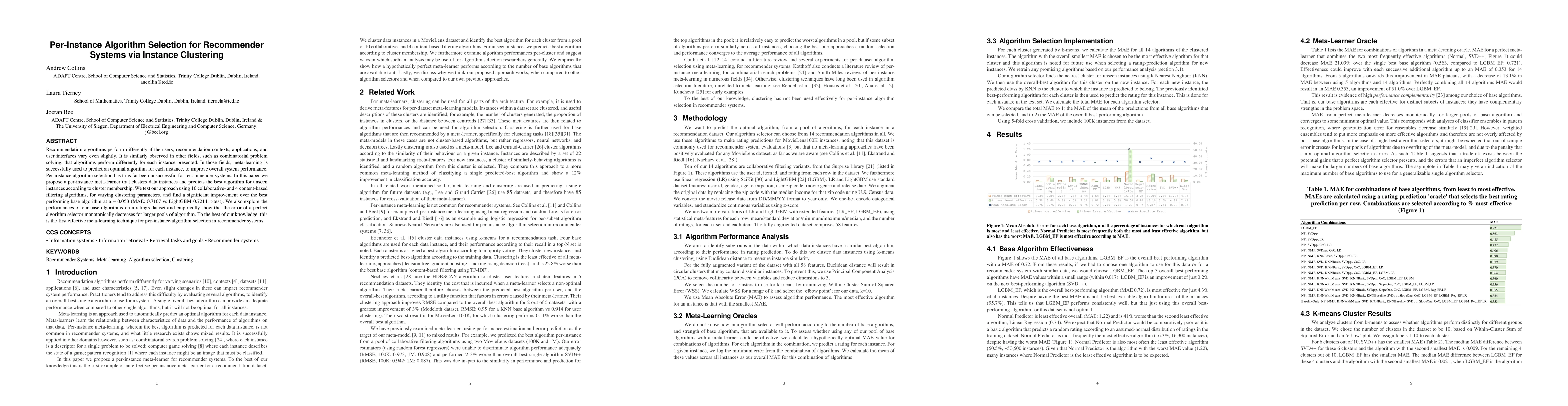 This paper proposes a meta-learning approach for per-instance algorithm selection in recommender systems by clustering data instances to predict the best algorithm for unseen instances. The method significantly improves performance over the best base algorithm, marking the first effective technique for this application in recommender systems.