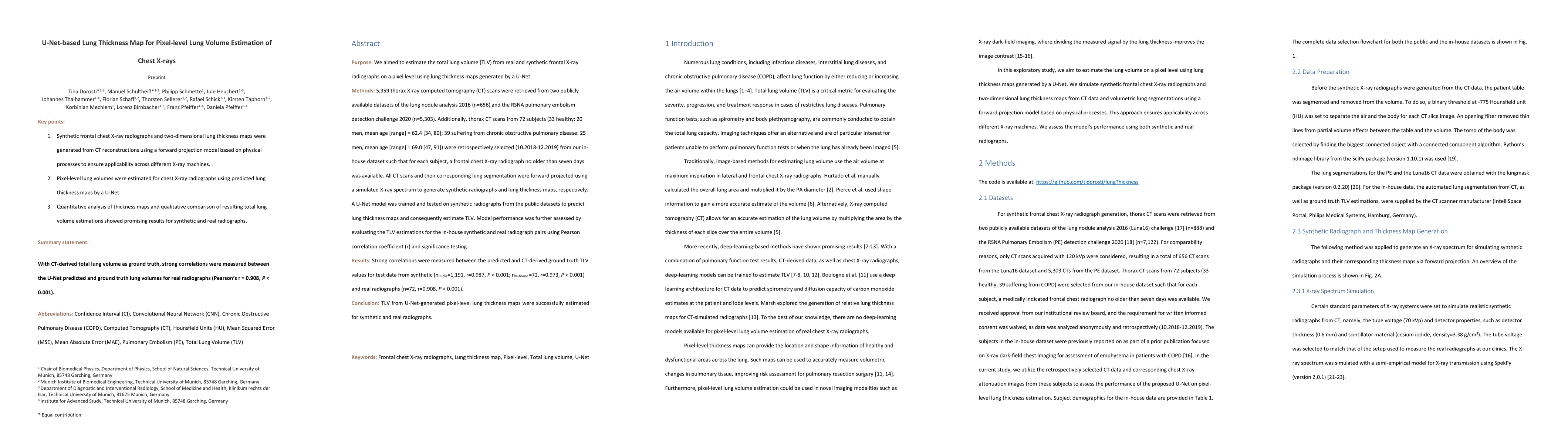 This research introduces a convolutional neural network method for estimating lung thickness per pixel and total lung capacity from chest X-rays. The network was trained and validated on simulated radiographs and tested on both synthetic and clinical X-rays, showing a mean-absolute error of 0.75 liters for clinical radiographs, improving to 0.69 liters when patient diameter is accounted for.