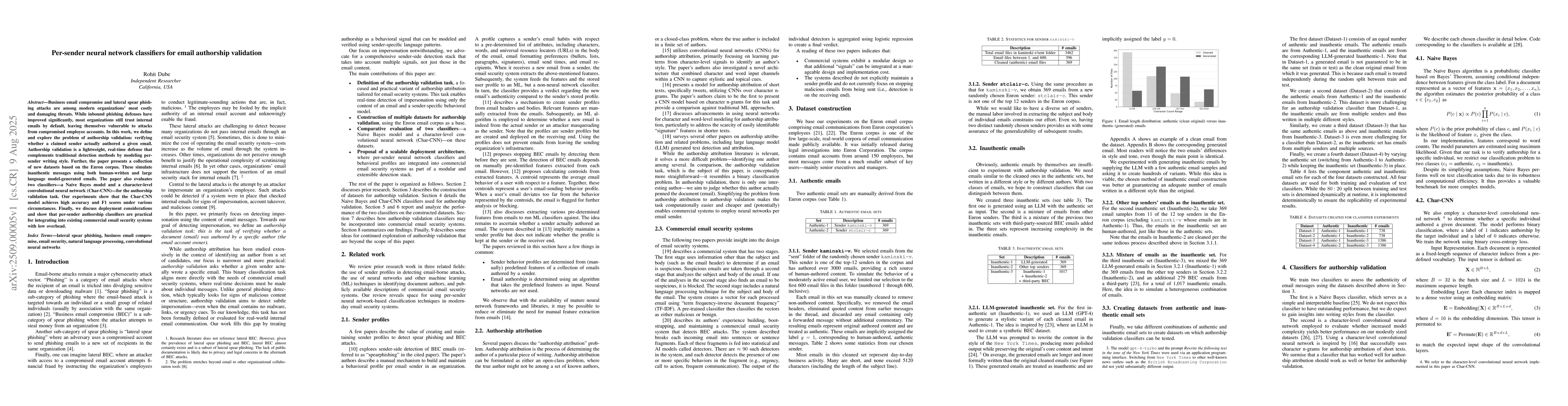 Business email compromise and lateral spear phishing attacks are among modern organizations' most costly and damaging threats. While inbound phishing defenses have improved significantly, most organizations still trust internal emails by default, leaving themselves vulnerable to attacks from compromised employee accounts. In this work, we define and explore the problem of authorship validation: verifying whether a claimed sender actually authored a given email. Authorship validation is a lightweight, real-time defense that complements traditional detection methods by modeling per-sender writing style. Further, the paper presents a collection of new datasets based on the Enron corpus. These simulate inauthentic messages using both human-written and large language model-generated emails. The paper also evaluates two classifiers -- a Naive Bayes model and a character-level convolutional neural network (Char-CNN) -- for the authorship validation task. Our experiments show that the Char-CNN model achieves high accuracy and F1 scores under various circumstances. Finally, we discuss deployment considerations and show that per-sender authorship classifiers are practical for integrating into existing commercial email security systems with low overhead.
