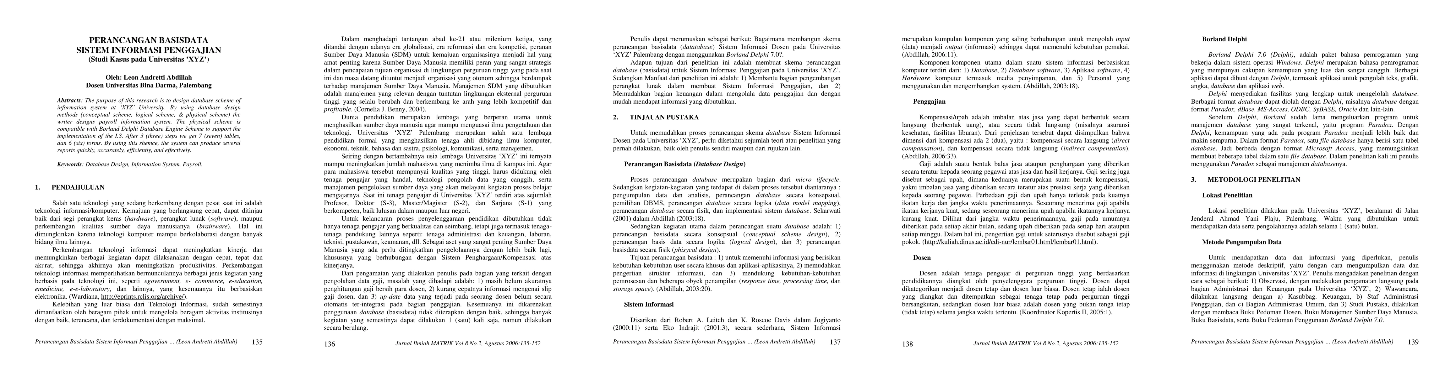 This research paper designs a payroll information system for XYZ University using database design methods, resulting in 7 tables and 6 forms that produce reports quickly and accurately. The system is compatible with Borland Delphi Database Engine Scheme.