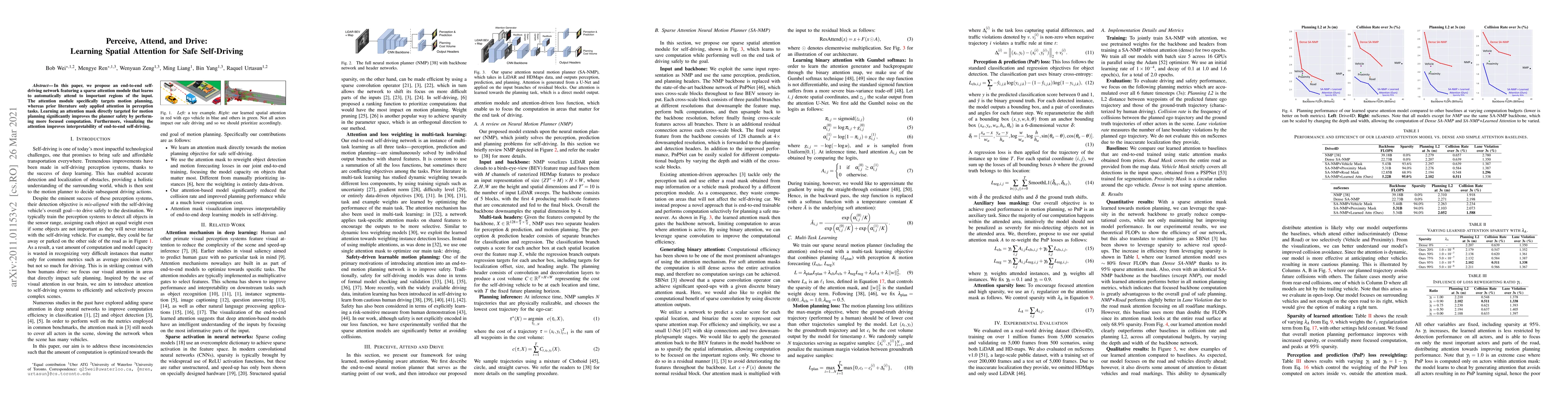 This paper introduces an end-to-end self-driving network with a sparse attention module that enhances motion planning safety by focusing computational resources on critical regions. The attention module's direct targeting of motion planning improves safety and interpretability compared to traditional perception-focused attention.