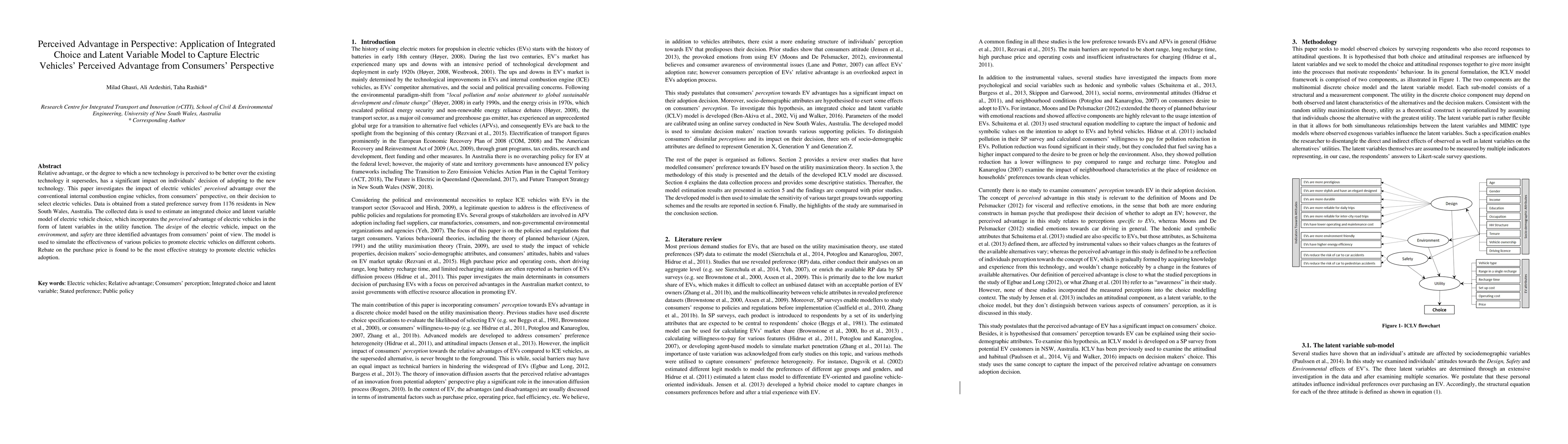This paper examines how perceived advantages of electric vehicles influence consumer adoption decisions using an integrated choice and latent variable model. Findings from a survey of 1176 Australian residents indicate that design, environmental impact, and safety are key perceived advantages, and a rebate on purchase price is the most effective policy for promoting electric vehicle adoption.