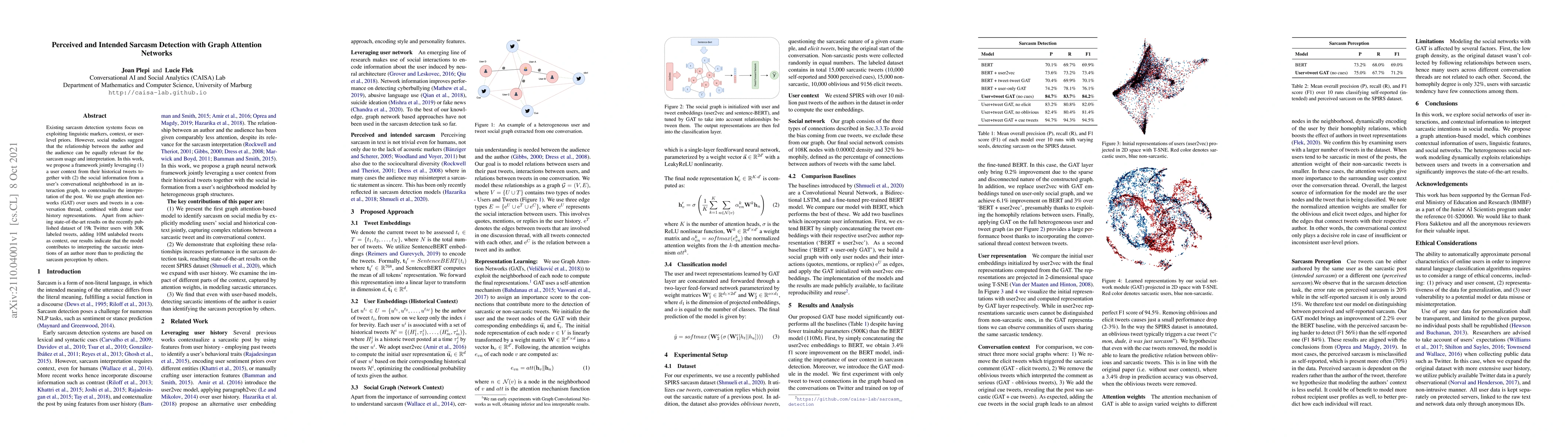 This paper proposes a framework using graph attention networks to detect sarcasm, integrating user context from historical tweets and social information from conversational networks. The model achieves top performance on a dataset but shows stronger results in interpreting author sarcasm intentions than in predicting audience perception.