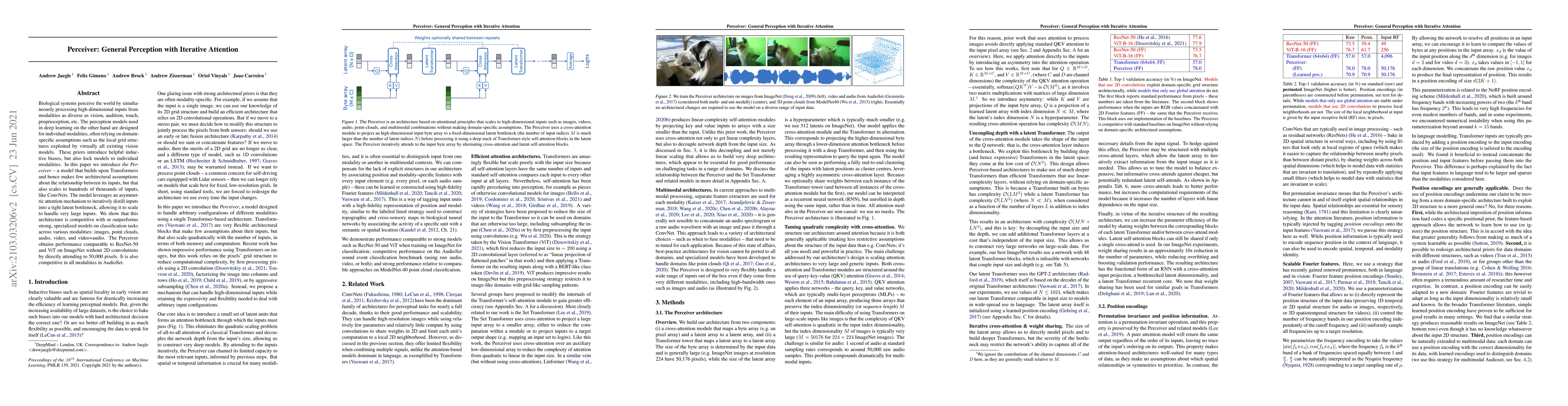 The Perceiver model uses iterative attention to generalize perception across diverse modalities, achieving competitive performance on classification tasks without modality-specific assumptions. It scales effectively to large inputs, matching the performance of specialized models like ResNet-50 and ViT on ImageNet.