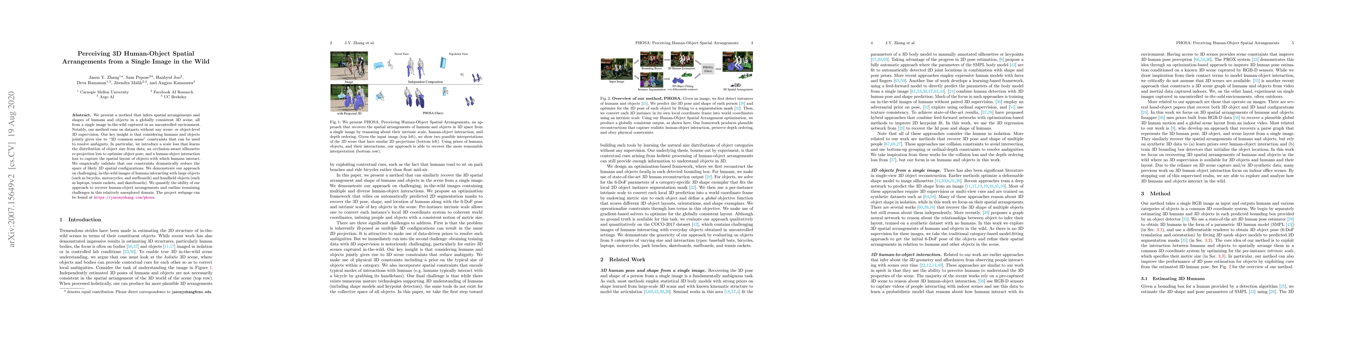 This paper introduces a method to infer 3D spatial arrangements of humans and objects from a single image in uncontrolled environments, leveraging "3D common sense" constraints. The approach uses a scale loss, occlusion-aware silhouette re-projection loss, and a human-object interaction loss to reduce ambiguity and recover likely 3D configurations.