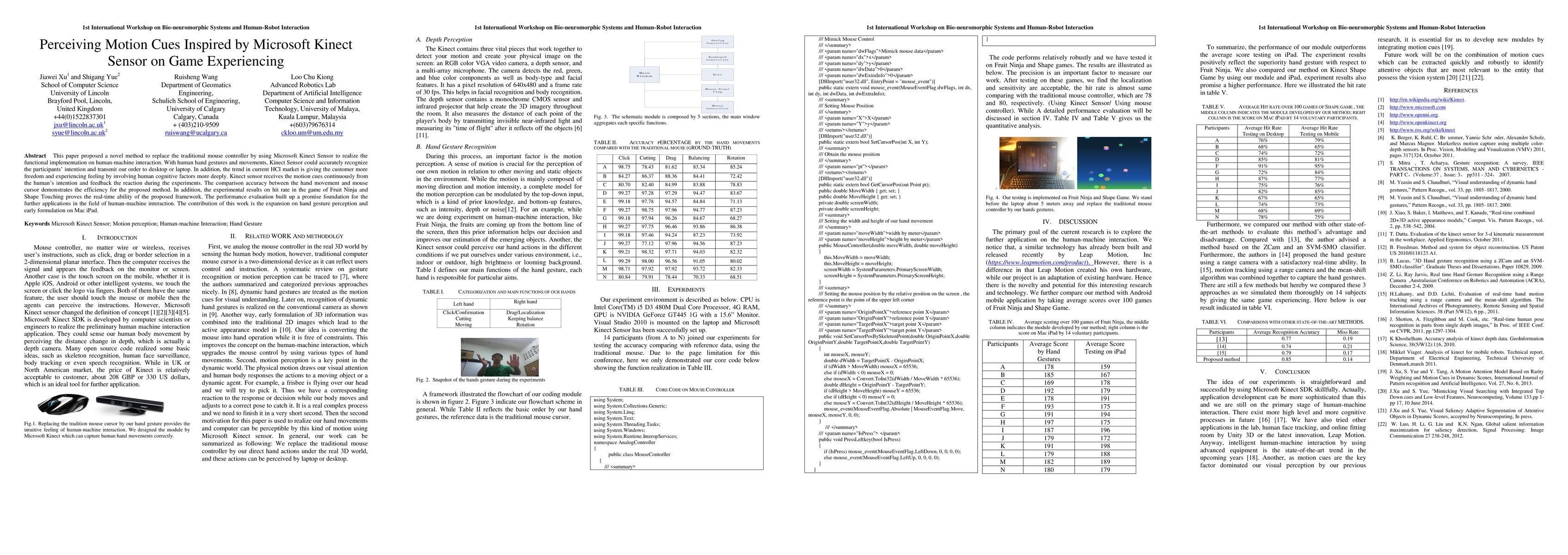 This paper proposed a novel method to replace the traditional mouse controller by using Microsoft Kinect Sensor to realize the functional implementation on human-machine interaction. With human hand gestures and movements, Kinect Sensor could accurately recognize the participants intention and transmit our order to desktop or laptop. In addition, the trend in current HCI market is giving the customer more freedom and experiencing feeling by involving human cognitive factors more deeply. Kinect sensor receives the motion cues continuously from the humans intention and feedback the reaction during the experiments. The comparison accuracy between the hand movement and mouse cursor demonstrates the efficiency for the proposed method. In addition, the experimental results on hit rate in the game of Fruit Ninja and Shape Touching proves the real-time ability of the proposed framework. The performance evaluation built up a promise foundation for the further applications in the field of human-machine interaction. The contribution of this work is the expansion on hand gesture perception and early formulation on Mac iPad.