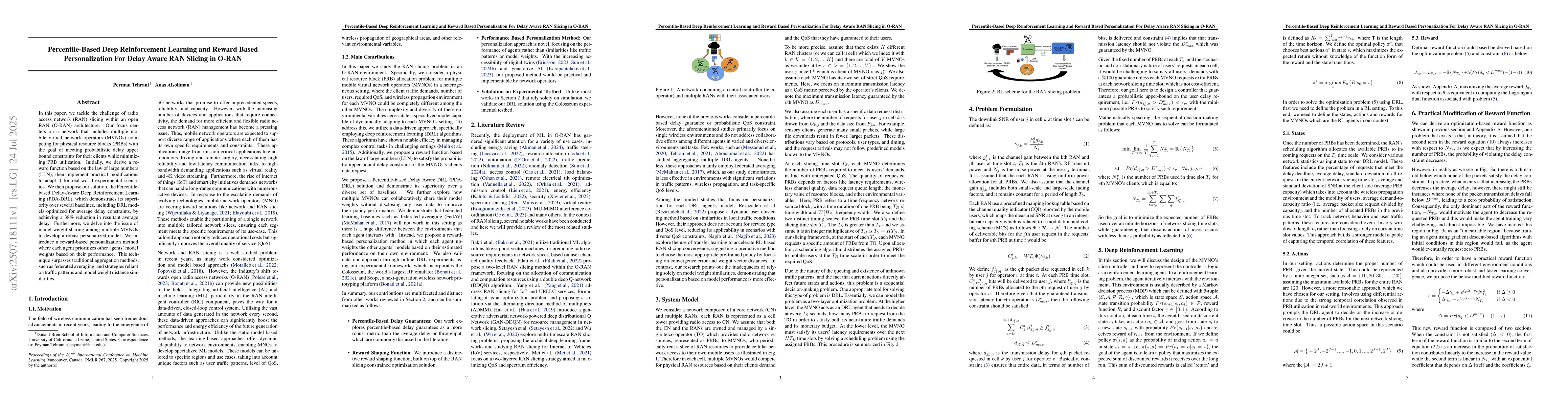 This research introduces Percentile-based Delay-Aware Deep Reinforcement Learning (PDA-DRL) for efficient RAN slicing in O-RAN, achieving a 38% reduction in average delay compared to baseline models. It also proposes a reward-based personalization method for MVNOs, outperforming traditional aggregation techniques.