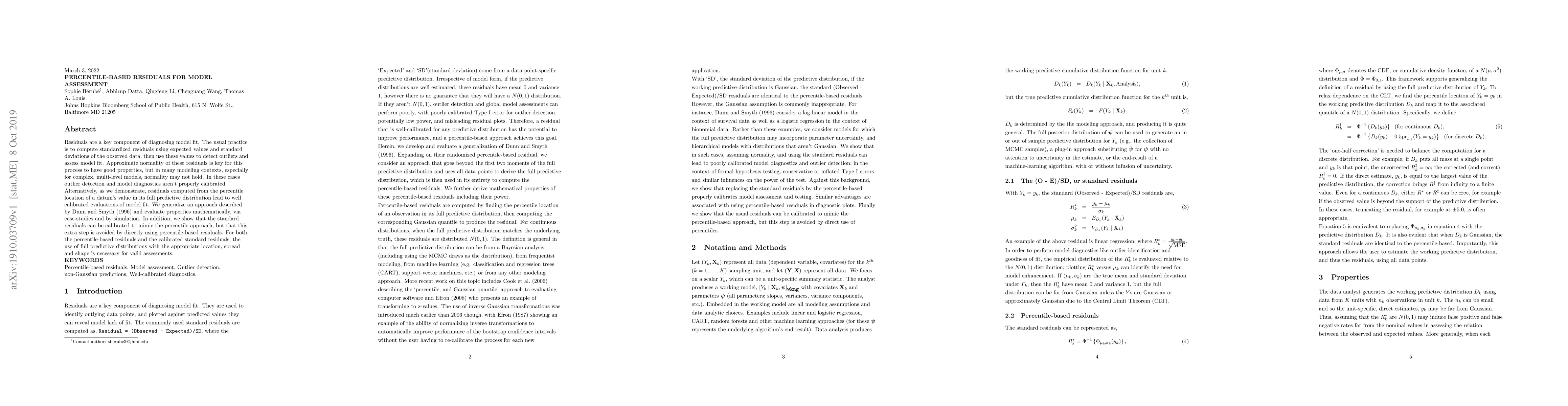 This paper proposes using percentile-based residuals for model assessment, which are derived from the predictive distribution of data, to provide better diagnostics for complex, non-normal models. It demonstrates that these residuals offer more accurate outlier detection and model fit evaluation compared to traditional standardized residuals.