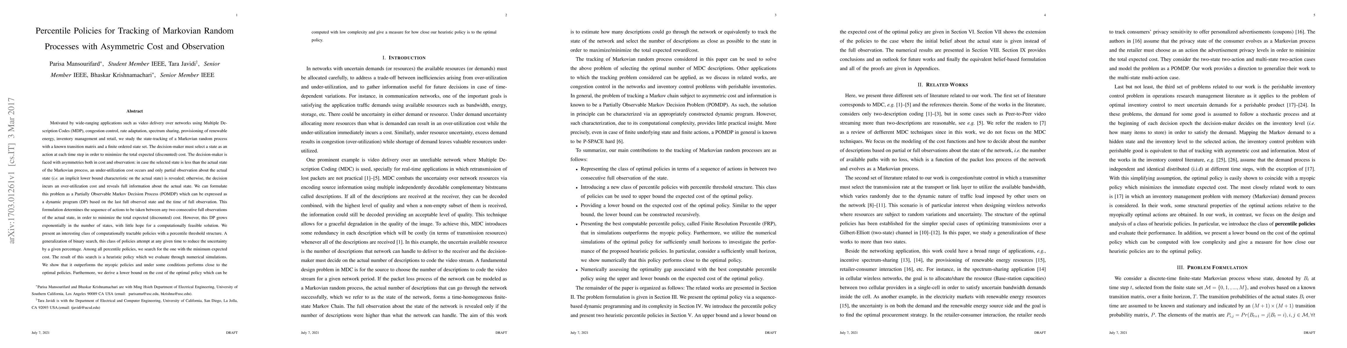 Motivated by wide-ranging applications such as video delivery over networks using Multiple Description Codes, congestion control, and inventory management, we study the state-tracking of a Markovian random process with a known transition matrix and a finite ordered state set. The decision-maker must select a state as an action at each time step to minimize the total expected cost. The decision-maker is faced with asymmetries both in cost and observation: in case the selected state is less than the actual state of the Markovian process, an under-utilization cost occurs and only partial observation about the actual state is revealed; otherwise, the decision incurs an over-utilization cost and reveals full information about the actual state. We can formulate this problem as a Partially Observable Markov Decision Process which can be expressed as a dynamic program based on the last full observed state and the time of full observation. This formulation determines the sequence of actions to be taken between any two consecutive full observations of the actual state. However, this DP grows exponentially in the number of states, with little hope for a computationally feasible solution. We present an interesting class of computationally tractable policies with a percentile structure. A generalization of binary search, this class of policies attempt at any given time to reduce the uncertainty by a given percentage. Among all percentile policies, we search for the one with the minimum expected cost. The result of this search is a heuristic policy which we evaluate through numerical simulations. We show that it outperforms the myopic policies and under some conditions performs close to the optimal policies. Furthermore, we derive a lower bound on the cost of the optimal policy which can be computed with low complexity and give a measure for how close our heuristic policy is to the optimal policy.