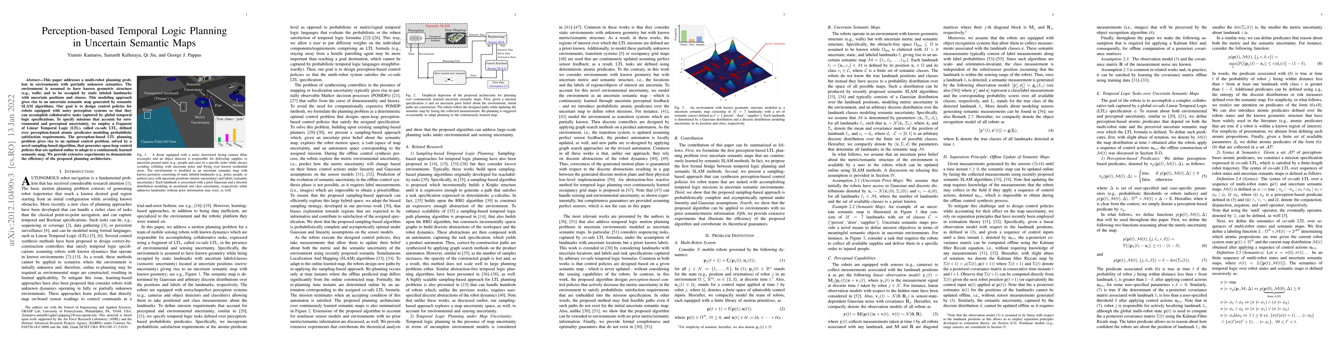 This paper addresses a multi-robot planning problem in environments with partially unknown semantics. The environment is assumed to have known geometric structure (e.g., walls) and to be occupied by static labeled landmarks with uncertain positions and classes. This modeling approach gives rise to an uncertain semantic map generated by semantic SLAM algorithms. Our goal is to design control policies for robots equipped with noisy perception systems so that they can accomplish collaborative tasks captured by global temporal logic specifications. To specify missions that account for environmental and perceptual uncertainty, we employ a fragment of Linear Temporal Logic (LTL), called co-safe LTL, defined over perception-based atomic predicates modeling probabilistic satisfaction requirements. The perception-based LTL planning problem gives rise to an optimal control problem, solved by a novel sampling-based algorithm, that generates open-loop control policies that are updated online to adapt to a continuously learned semantic map. We provide extensive experiments to demonstrate the efficiency of the proposed planning architecture.