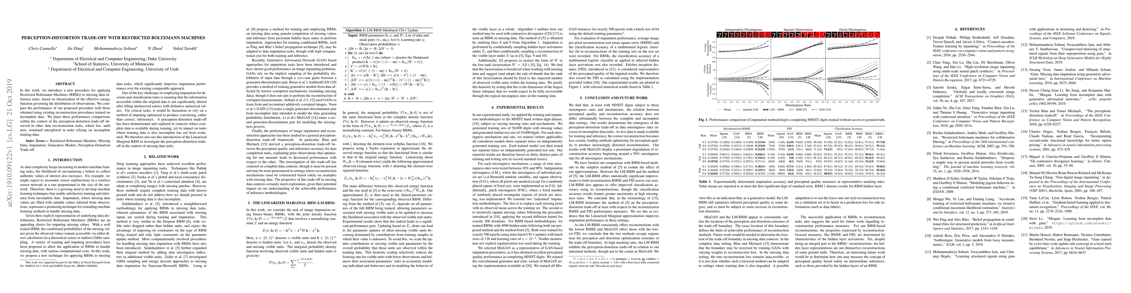 In this work, we introduce a new procedure for applying Restricted Boltzmann Machines (RBMs) to missing data inference tasks, based on linearization of the effective energy function governing the distribution of observations. We compare the performance of our proposed procedure with those obtained using existing reconstruction procedures trained on incomplete data. We place these performance comparisons within the context of the perception-distortion trade-off observed in other data reconstruction tasks, which has, until now, remained unexplored in tasks relying on incomplete training data.
