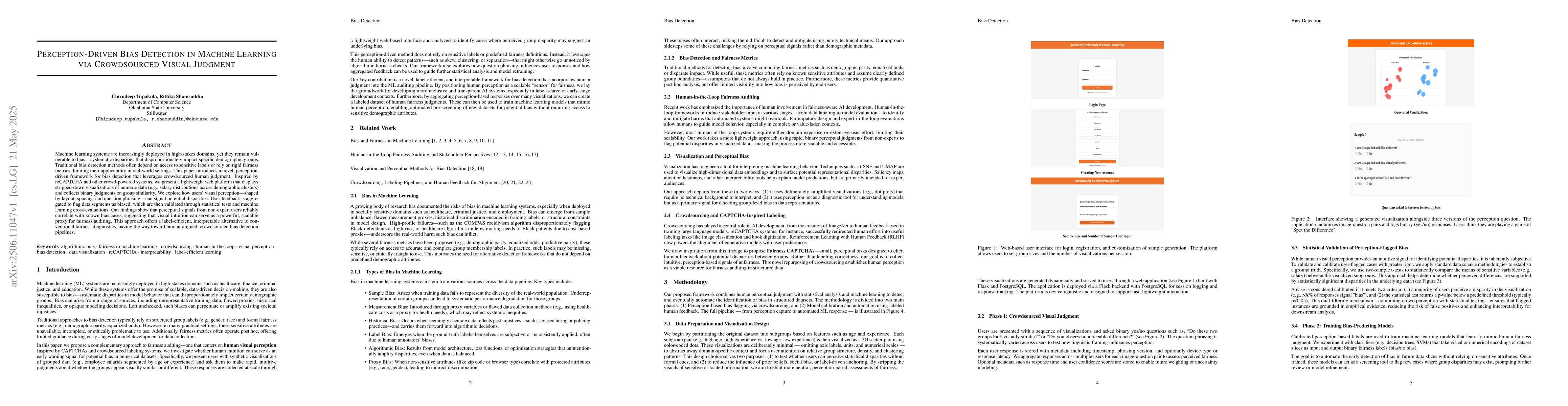 Machine learning systems are increasingly deployed in high-stakes domains, yet they remain vulnerable to bias systematic disparities that disproportionately impact specific demographic groups. Traditional bias detection methods often depend on access to sensitive labels or rely on rigid fairness metrics, limiting their applicability in real-world settings. This paper introduces a novel, perception-driven framework for bias detection that leverages crowdsourced human judgment. Inspired by reCAPTCHA and other crowd-powered systems, we present a lightweight web platform that displays stripped-down visualizations of numeric data (for example-salary distributions across demographic clusters) and collects binary judgments on group similarity. We explore how users' visual perception-shaped by layout, spacing, and question phrasing can signal potential disparities. User feedback is aggregated to flag data segments as biased, which are then validated through statistical tests and machine learning cross-evaluations. Our findings show that perceptual signals from non-expert users reliably correlate with known bias cases, suggesting that visual intuition can serve as a powerful, scalable proxy for fairness auditing. This approach offers a label-efficient, interpretable alternative to conventional fairness diagnostics, paving the way toward human-aligned, crowdsourced bias detection pipelines.