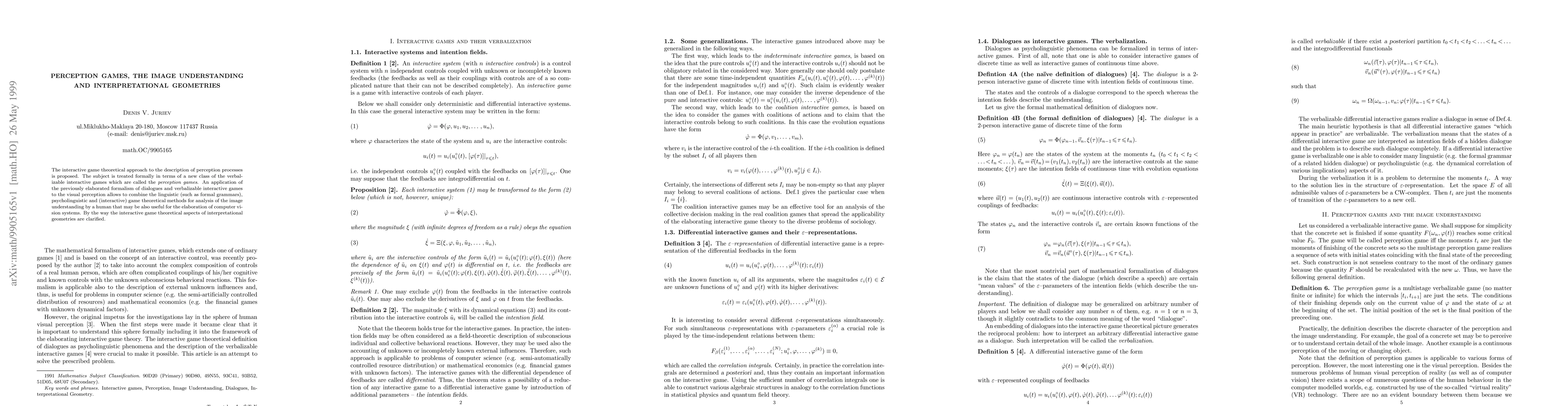 The interactive game theoretical approach to the description of perception processes is proposed. The subject is treated formally in terms of a new class of the verbalizable interactive games which are called the perception games. An application of the previously elaborated formalism of dialogues and verbalizable interactive games to the visual perception allows to combine the linguistic (such as formal grammars), psycholinguistic and (interactive) game theoretical methods for analysis of the image understanding by a human that may be also useful for the elaboration of computer vision systems. By the way the interactive game theoretical aspects of interpretational geometries are clarified.