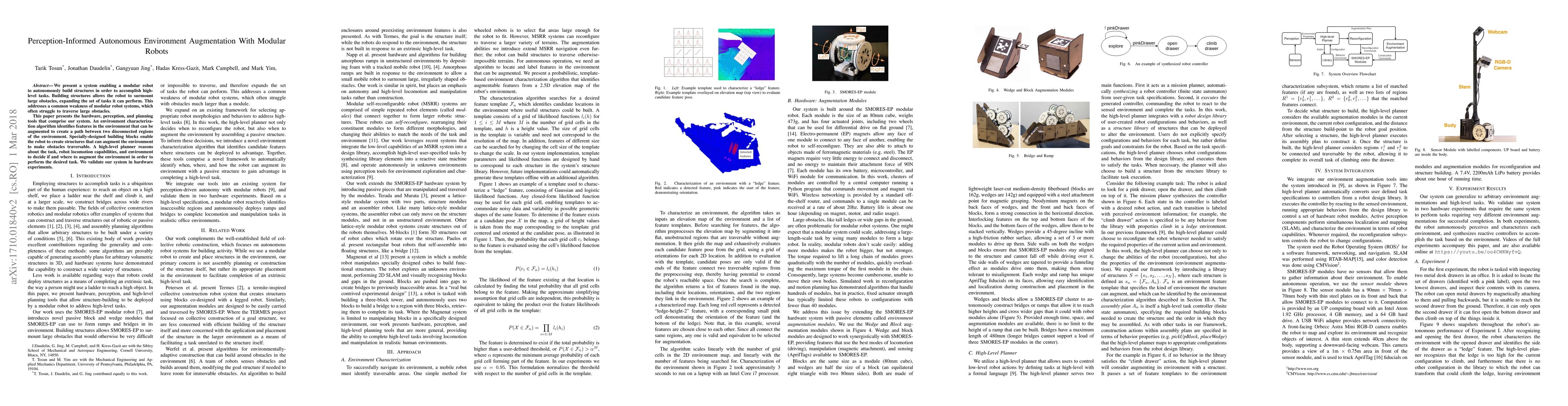 A modular robot system enables autonomous structure building to overcome large obstacles, expanding its task capabilities. The system uses perception and planning tools to identify and augment necessary paths in the environment.