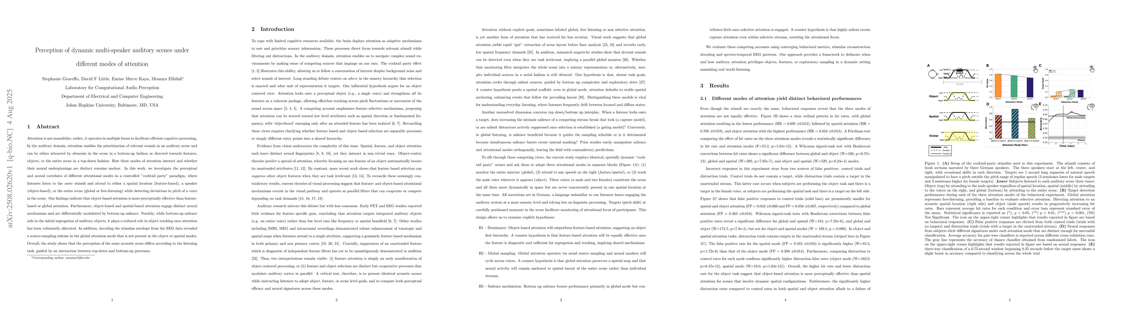 Attention is not monolithic; rather, it operates in multiple forms to facilitate efficient cognitive processing. In the auditory domain, attention enables the prioritization of relevant sounds in an auditory scene and can be either attracted by elements in the scene in a bottom-up fashion or directed towards features, objects, or the entire scene in a top-down fashion. How these modes of attention interact and whether their neural underpinnings are distinct remains unclear. In this work, we investigate the perceptual and neural correlates of different attentional modes in a controlled "cocktail party" paradigm, where listeners listen to the same stimuli and attend to either a spatial location (feature-based), a speaker (object-based), or the entire scene (global or free-listening) while detecting deviations in pitch of a voice in the scene. Our findings indicate that object-based attention is more perceptually effective than feature-based or global attention. Furthermore, object-based and spatial-based attention engage distinct neural mechanisms and are differentially modulated by bottom-up salience. Notably, while bottom-up salience aids in the initial segregation of auditory objects, it plays a reduced role in object tracking once attention has been voluntarily allocated. In addition, decoding the stimulus envelope from the EEG data revealed a source-sampling scheme in the global attention mode that is not present in the object or spatial modes. Overall, the study shows that the perception of the same acoustic scene differs according to the listening task, guided by an interaction between top-down and bottom-up processes.