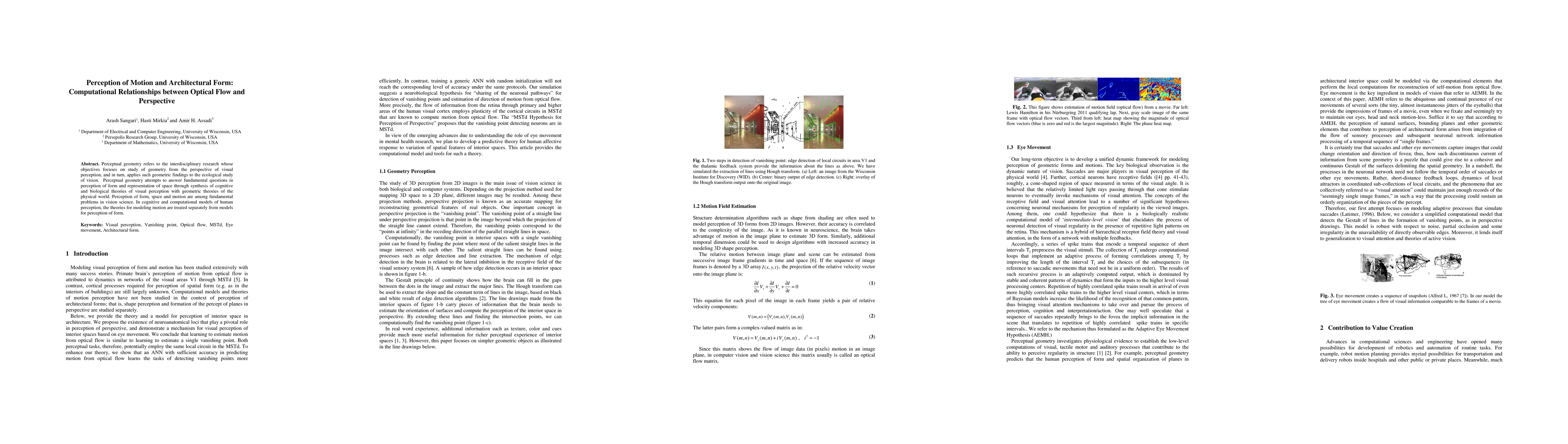 Perceptual geometry refers to the interdisciplinary research whose objectives focuses on study of geometry from the perspective of visual perception, and in turn, applies such geometric findings to the ecological study of vision. Perceptual geometry attempts to answer fundamental questions in perception of form and representation of space through synthesis of cognitive and biological theories of visual perception with geometric theories of the physical world. Perception of form, space and motion are among fundamental problems in vision science. In cognitive and computational models of human perception, the theories for modeling motion are treated separately from models for perception of form.