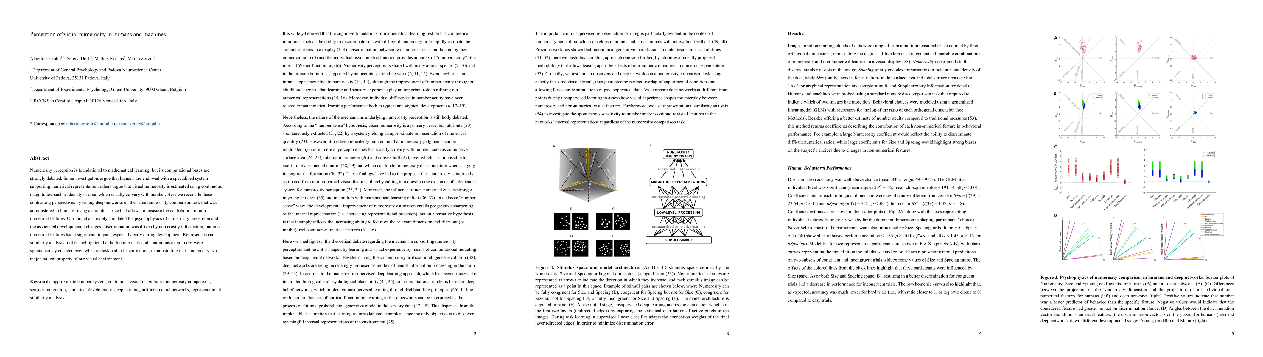 This paper explores the perception of visual numerosity in humans and machines, demonstrating that both numerosity and continuous magnitudes are encoded in deep networks, mirroring human developmental changes in numerosity discrimination. The study finds that while numerosity is a primary factor, non-numerical features significantly influence perception, especially in early development.