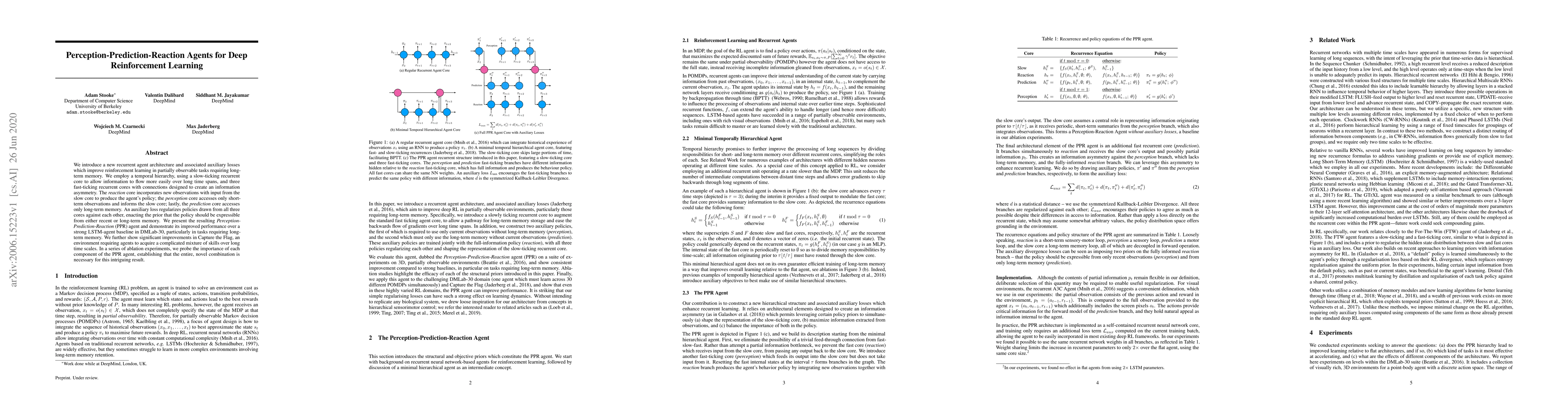 We introduce a new recurrent agent architecture and associated auxiliary losses which improve reinforcement learning in partially observable tasks requiring long-term memory. We employ a temporal hierarchy, using a slow-ticking recurrent core to allow information to flow more easily over long time spans, and three fast-ticking recurrent cores with connections designed to create an information asymmetry. The \emph{reaction} core incorporates new observations with input from the slow core to produce the agent's policy; the \emph{perception} core accesses only short-term observations and informs the slow core; lastly, the \emph{prediction} core accesses only long-term memory. An auxiliary loss regularizes policies drawn from all three cores against each other, enacting the prior that the policy should be expressible from either recent or long-term memory. We present the resulting \emph{Perception-Prediction-Reaction} (PPR) agent and demonstrate its improved performance over a strong LSTM-agent baseline in DMLab-30, particularly in tasks requiring long-term memory. We further show significant improvements in Capture the Flag, an environment requiring agents to acquire a complicated mixture of skills over long time scales. In a series of ablation experiments, we probe the importance of each component of the PPR agent, establishing that the entire, novel combination is necessary for this intriguing result.