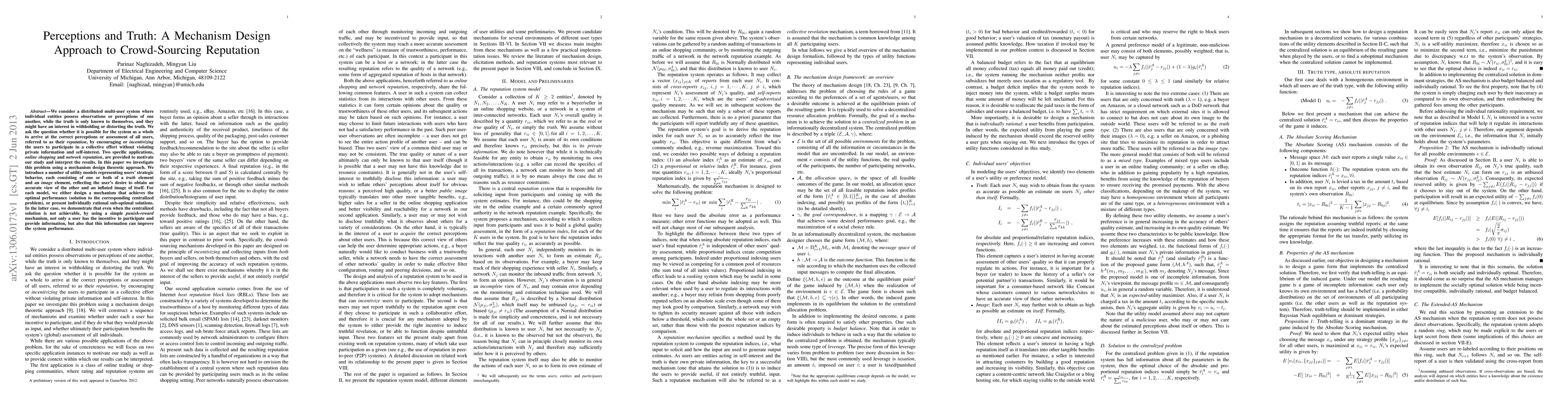 We consider a distributed multi-user system where individual entities possess observations or perceptions of one another, while the truth is only known to themselves, and they might have an interest in withholding or distorting the truth. We ask the question whether it is possible for the system as a whole to arrive at the correct perceptions or assessment of all users, referred to as their reputation, by encouraging or incentivizing the users to participate in a collective effort without violating private information and self-interest. Two specific applications, online shopping and network reputation, are provided to motivate our study and interpret the results. In this paper we investigate this problem using a mechanism design theoretic approach. We introduce a number of utility models representing users' strategic behavior, each consisting of one or both of a truth element and an image element, reflecting the user's desire to obtain an accurate view of the other and an inflated image of itself. For each model, we either design a mechanism that achieves the optimal performance (solution to the corresponding centralized problem), or present individually rational sub-optimal solutions. In the latter case, we demonstrate that even when the centralized solution is not achievable, by using a simple punish-reward mechanism, not only a user has the incentive to participate and provide information, but also that this information can improve the system performance.