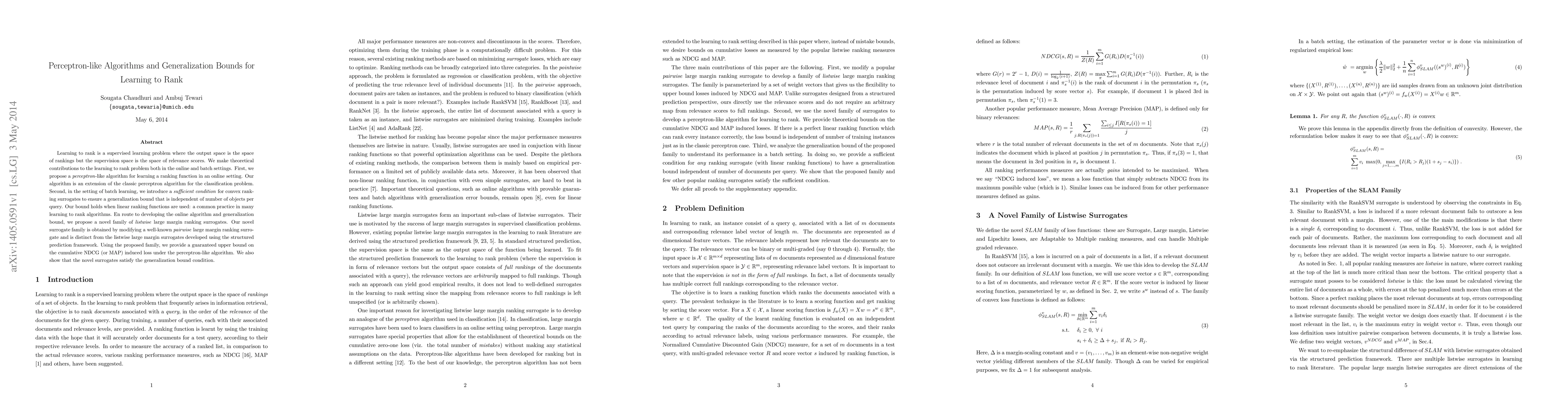 This paper proposes a perceptron-like algorithm for online learning to rank and introduces a generalization bound for batch learning to rank, ensuring performance independent of the number of objects per query. It also develops a novel family of listwise large margin ranking surrogates to achieve these results.