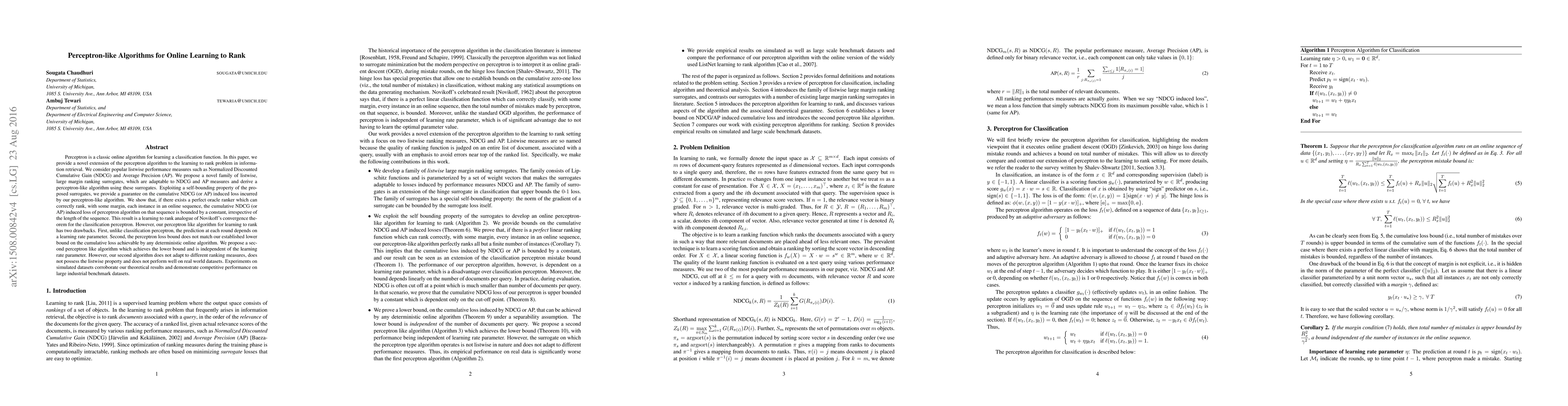 This paper extends the perceptron algorithm to online learning to rank, proposing a new family of listwise ranking surrogates analogous to the hinge loss. It provides theoretical guarantees on the cumulative loss for ranking tasks, demonstrating convergence akin to Novikoff's theorem and presenting empirical validation on datasets.
