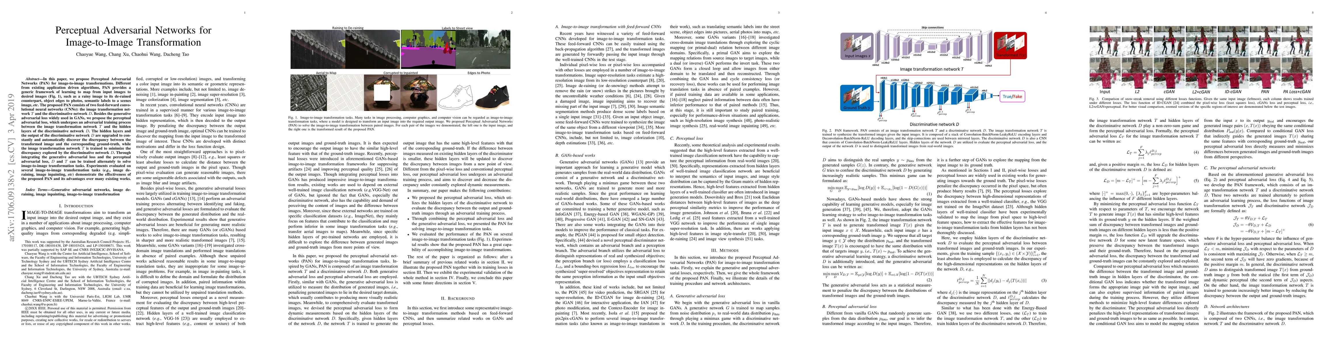 This paper introduces Perceptual Adversarial Networks (PAN) for generic image-to-image transformation tasks, employing a framework that combines generative adversarial loss with perceptual adversarial loss to improve transformation accuracy. PAN outperforms state-of-the-art methods in tasks like de-raining and inpainting.