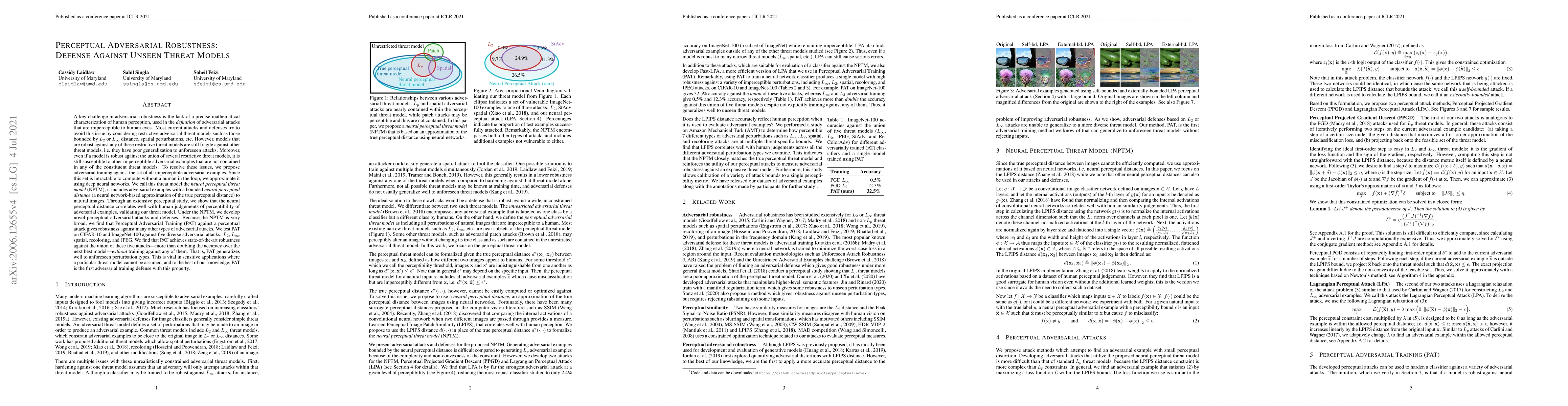 This paper proposes Perceptual Adversarial Training (PAT) to defend against adversarial examples that are imperceptible to human perception, introducing the neural perceptual threat model (NPTM). PAT achieves state-of-the-art robustness against diverse adversarial attacks on CIFAR-10 and ImageNet-100, generalizing well to unforeseen perturbation types.